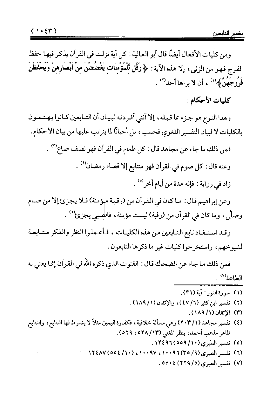 وهذا النوع هو جزء مما قبله، إلا أنني أفردته لبيان أن التابعين كانوا يهتمون بالكليات لا لبيان التفسير اللغوي فحسب، بل أحيانا لما يترتب عليها من بيان الأحكام.