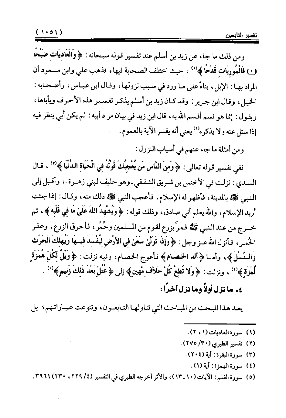 ومن ذلك ما جاء عن زيد بن أسلم عند تفسير قوله سبحانه: {وَالْعَادِيَاتِ ضَبْحاً (1) فَالْمُورِيَاتِ قَدْحاً} (¬1)، حيث اختلف الصحابة فيها، فذهب علي وابن مسعود أن المراد بها: الإبل، بناء على ما ورد في سبب نزولها، وقال ابن عباس، وأصحابه: