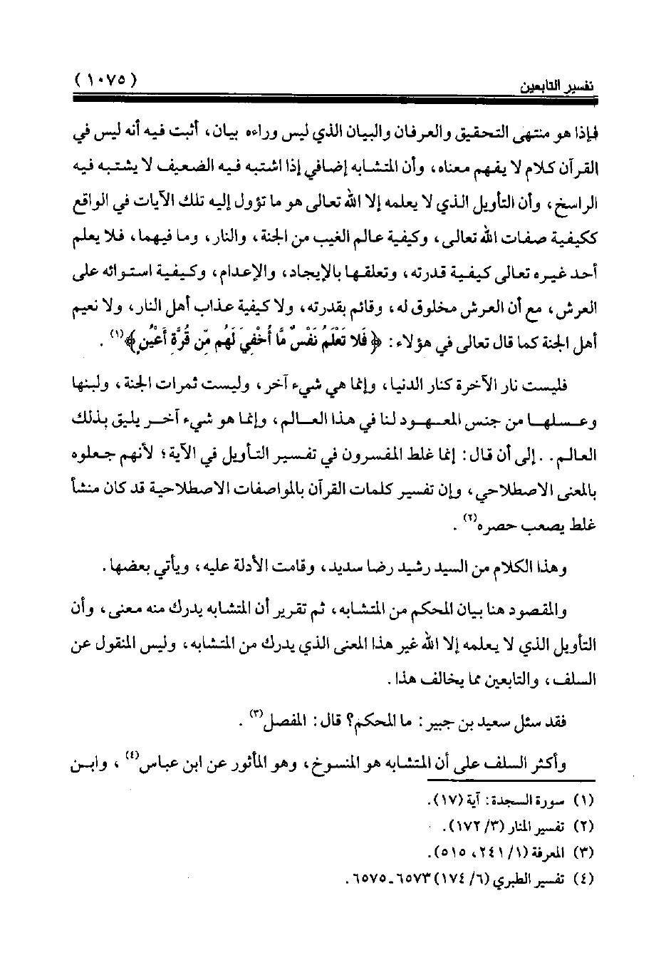 فإذا هو منتهى التحقيق والعرفان والبيان الذي ليس وراءه بيان، أثبت فيه أنه ليس في القرآن كلام لا يفهم معناه، وأن المتشابه إضافي إذا اشتبه فيه الضعيف لا يشتبه فيه الراسخ، وأن التأويل الذي لا يعلمه إلا الله تعالى هو ما تؤول إليه تلك الآيات في الواقع ككيفية صفات الله تعالى، وكيفية عالم الغيب من الجنة، والنار، وما فيهما، فلا يعلم أحد غيره تعالى كيفية قدرته، وتعلقها بالإيجاد، والإعدام، وكيفية استوائه على العرش، مع أن العرش مخلوق له، وقائم بقدرته، ولا كيفية عذاب أهل النار، ولا نعيم أهل الجنة كما قال تعالى في هؤلاء: {فَلَا تَعْلَمُ نَفْسٌ مَا أُخْفِيَ لَهُمْ مِنْ قُرَّةِ أَعْيُنٍ} (¬1).