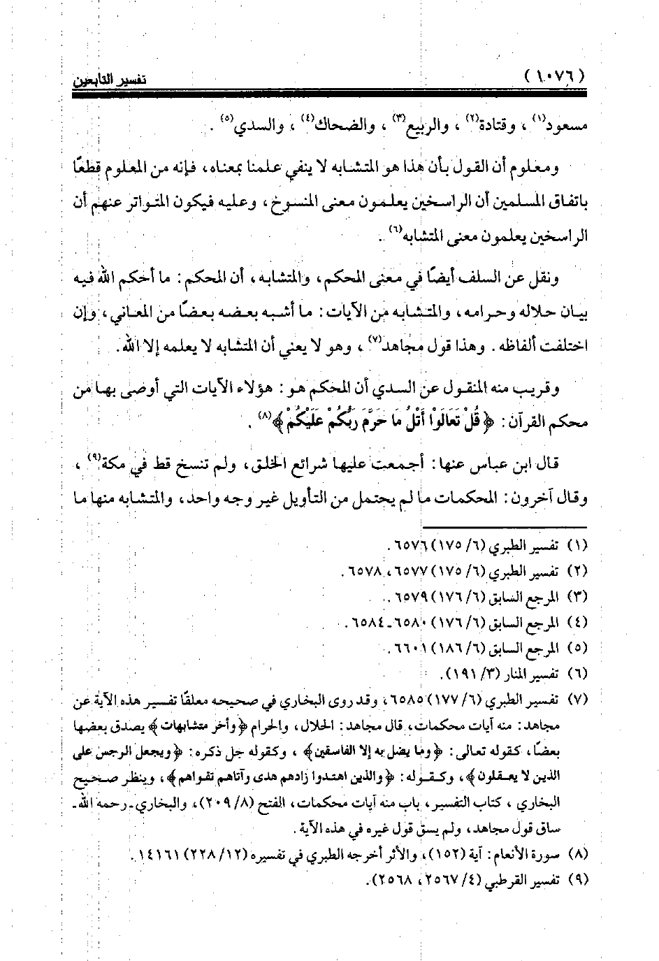 (¬7) تفسير الطبري (6/ 177) 6585، وقد روى البخاري في صحيحه معلقا تفسير هذه الآية عن مجاهد: منه آيات محكمات، قال مجاهد: الحلال، والحرام {وَأُخَرُ مُتَشَابِهَاتٌ} يصدق بعضها بعضا، كقوله تعالى: {وَمَا يُضِلُّ بِهِ إِلَّا الْفَاسِقِينَ}، وكقوله جل ذكره: {وَيَجْعَلُ الرِّجْسَ عَلَى الَّذِينَ لَا يَعْقِلُونَ}، وكقوله: {وَالَّذِينَ اهْتَدَوْا زَادَهُمْ هُدىً وَآتَاهُمْ تَقْوَاهُمْ}، وينظر صحيح البخاري، كتاب التفسير، باب منه آيات محكمات، الفتح (8/ 209)، والبخاري رحمه الله ساق قول مجاهد، ولم يسق قول غيره في هذه الآية.