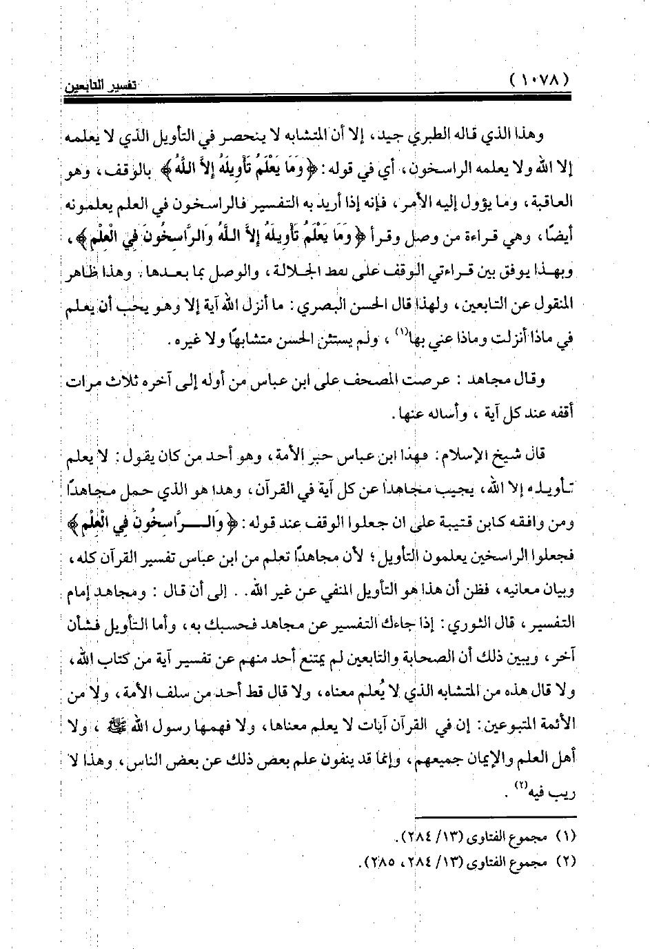 قال شيخ الإسلام: فهذا ابن عباس حبر الأمة، وهو أحد من كان يقول: لا يعلم تأويله إلا الله، يجيب مجاهدا عن كل آية في القرآن، وهذا هو الذي حمل مجاهدا ومن وافقه كابن قتيبة على ان جعلوا الوقف عند قوله: {وَالرَّاسِخُونَ فِي الْعِلْمِ}