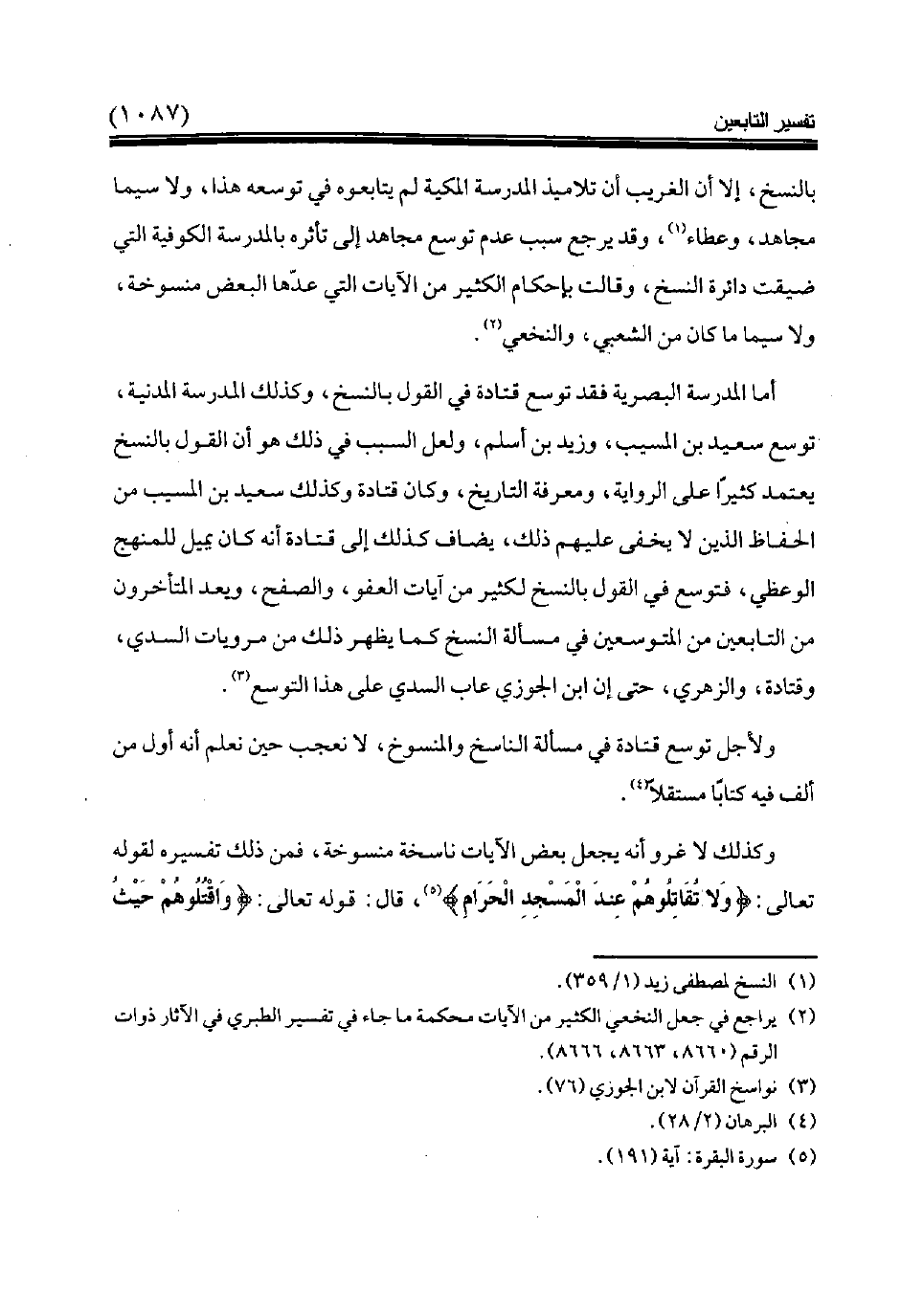 بالنسخ، إلا أن الغريب أن تلاميذ المدرسة المكية لم يتابعوه في توسعه هذا، ولا سيما مجاهد، وعطاء (¬1)، وقد يرجع سبب عدم توسع مجاهد إلى تأثره بالمدرسة الكوفية التي ضيقت دائرة النسخ، وقالت بإحكام الكثير من الآيات التي عدّها البعض منسوخة، ولا سيما ما كان من الشعبي، والنخعي (¬2).