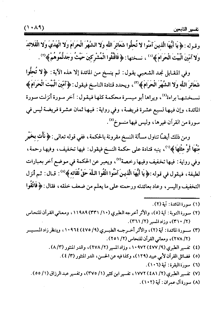 وفي المقابل نجد الشعبي يقول: لم ينسخ من المائدة إلا هذه الآية: {لَا تُحِلُّوا شَعَائِرَ اللَّهِ وَلَا الشَّهْرَ الْحَرَامَ} (¬3)، ويحدد قتادة الناسخ فيقول: {آمِّينَ الْبَيْتَ الْحَرَامَ}