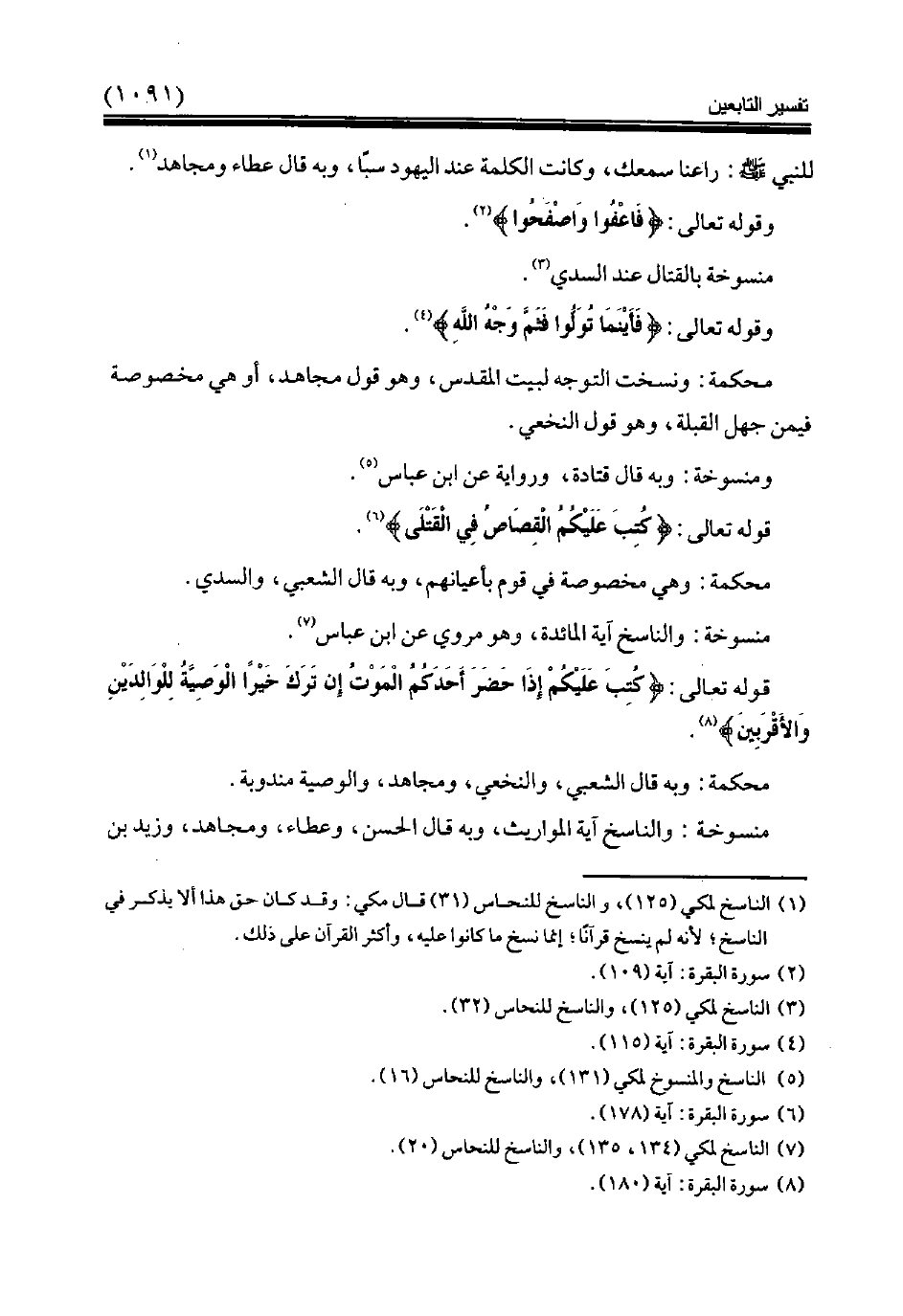 (¬1) الناسخ لمكي (125)، والناسخ للنحاس (31) قال مكي: وقد كان حق هذا ألا يذكر في الناسخ لأنه لم ينسخ قرآنا إنما نسخ ما كانوا عليه، وأكثر القرآن على ذلك.