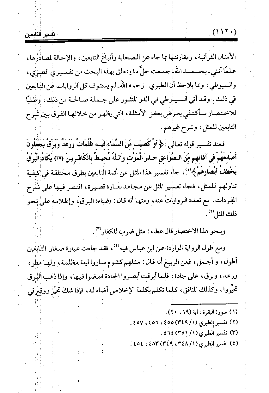 الأمثال القرآنية، ومقارنتها بما جاء عن الصحابة وأتباع التابعين، والإحالة لمصادرها، علما أنني بحمد الله جمعت جلّ ما يتعلق بهذا البحث من تفسيري الطبري، والسيوطي، ومما يلاحظ أن الطبري رحمه الله لم يستوف كل الروايات عن التابعين في ذلك، وقد أتى السيوطي في الدر المنثور على جملة صالحة من ذلك، وطلبا للاختصار سأكتفي بعرض بعض الأمثلة، التي يظهر من خلالها الفرق بين شرح التابعين للمثل، وشرح غيرهم.