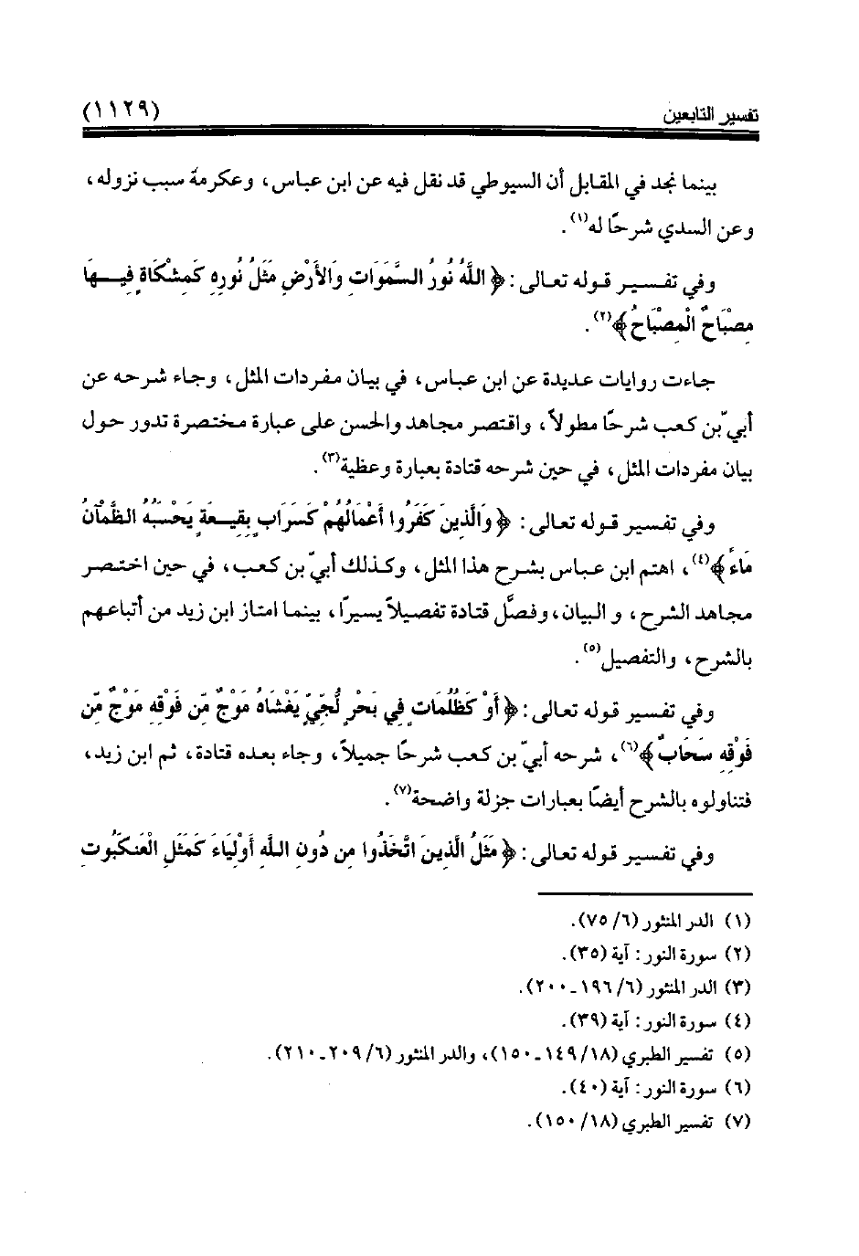 وفي تفسير قوله تعالى: {وَالَّذِينَ كَفَرُوا أَعْمَالُهُمْ كَسَرَابٍ بِقِيعَةٍ يَحْسَبُهُ الظَّمْآنُ مَاءً} (¬4)، اهتم ابن عباس بشرح هذا المثل، وكذلك أبيّ بن كعب، في حين اختصر مجاهد الشرح، والبيان، وفصّل قتادة تفصيلا يسيرا، بينما امتاز ابن زيد من أتباعهم بالشرح، والتفصيل (¬5).