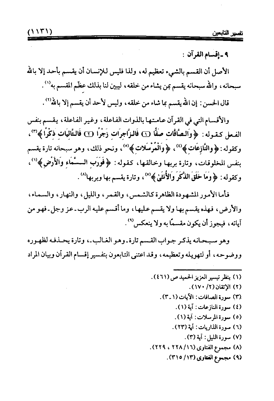 وهو سبحانه يذكر جواب القسم تارة وهو الغالب، وتارة يحذفه لظهوره ووضوحه، أو لتهويله وتعظيمه، وقد اعتنى التابعون بتفسير إقسام القرآن وبيان المراد