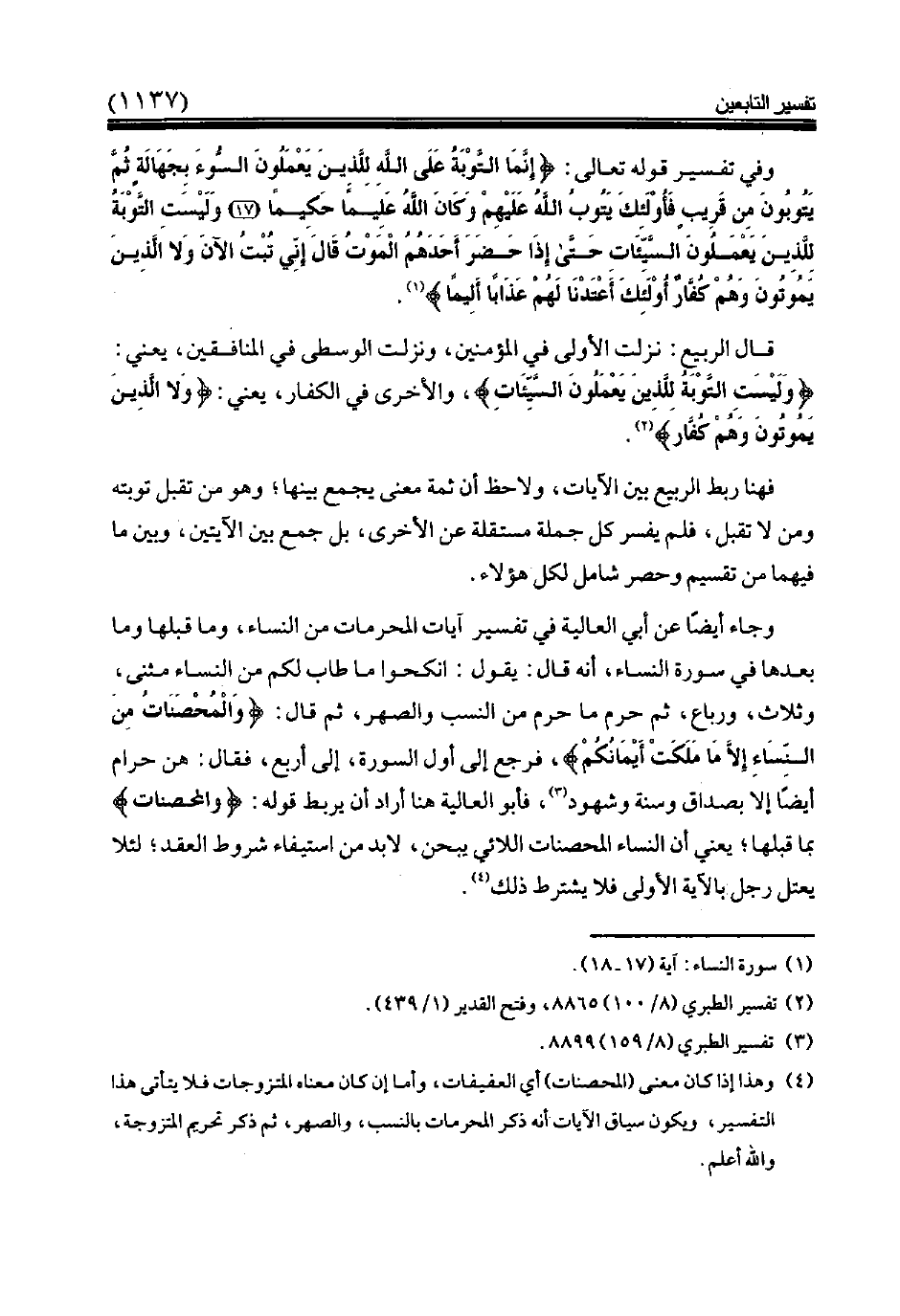 وجاء أيضا عن أبي العالية في تفسير آيات المحرمات من النساء، وما قبلها وما بعدها في سورة النساء، أنه قال: يقول: انكحوا ما طاب لكم من النساء مثنى، وثلاث، ورباع، ثم حرم ما حرم من النسب والصهر، ثم قال: {وَالْمُحْصَنَاتُ مِنَ النِّسَاءِ إِلَّا مَا مَلَكَتْ أَيْمَانُكُمْ}، فرجع إلى أول السورة، إلى أربع، فقال: هن حرام أيضا إلا بصداق وسنة وشهود (¬3)، فأبو العالية هنا أراد أن يربط قوله: {وَالْمُحْصَنَاتُ}