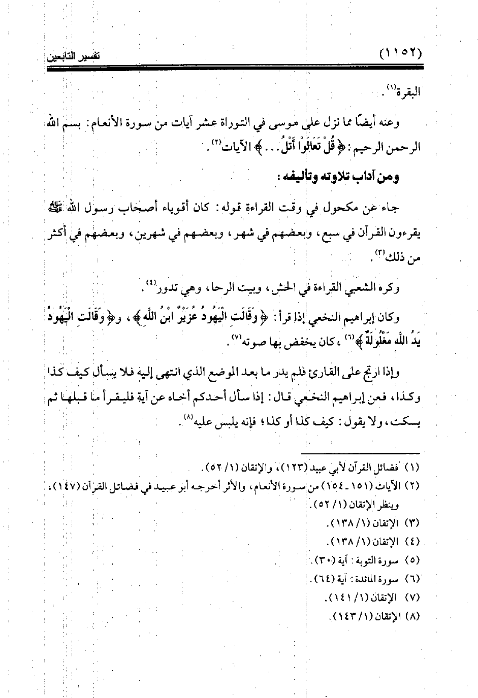 (¬2) الآيات (154151) من سورة الأنعام، والأثر أخرجه أبو عبيد في فضائل القرآن (147)، وينظر الإتقان (1/ 52).