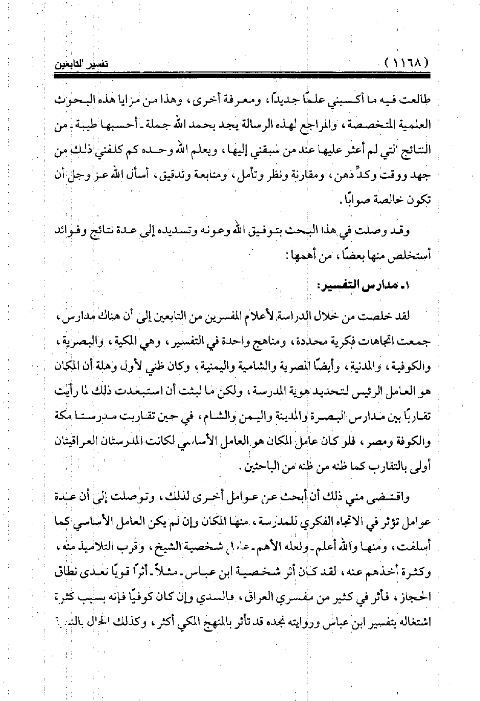 لقد خلصت من خلال الدراسة لأعلام المفسرين من التابعين إلى أن هناك مدارس، جمعت اتجاهات فكرية محددة، ومناهج واحدة في التفسير، وهي المكية، والبصرية، والكوفية، والمدنية، وأيضا المصرية والشامية واليمنية، وكان ظني لأول وهلة أن المكان هو العامل الرئيس لتحديد هوية المدرسة، ولكن ما لبثت أن استبعدت ذلك لما رأيت تقاربا بين مدارس البصرة والمدينة واليمن والشام، في حين تقاربت مدرستا مكة والكوفة ومصر، فلو كان عامل المكان هو العامل الأساسي لكانت المدرستان العراقيتان أولى بالتقارب كما ظنه من ظنه من الباحثين.
