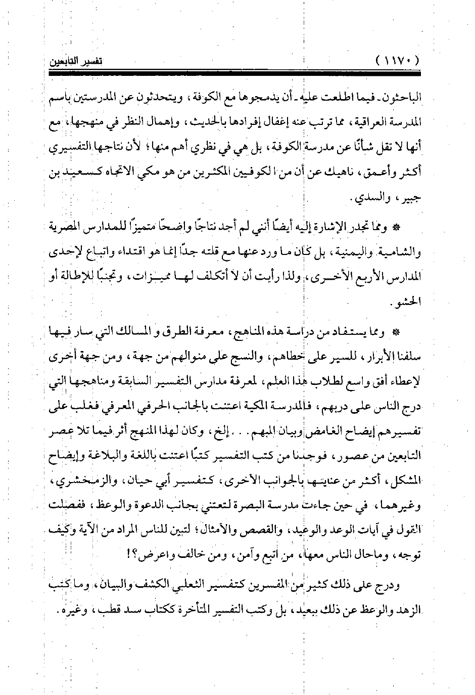 * ومما يستفاد من دراسة هذه المناهج، معرفة الطرق والمسالك التي سار فيها سلفنا الأبرار، للسير على خطاهم، والنسج على منوالهم من جهة، ومن جهة أخرى لإعطاء أفق واسع لطلاب هذا العلم، لمعرفة مدارس التفسير السابقة ومناهجها التي درج الناس على دربهم، فالمدرسة المكية اعتنت بالجانب الحرفي المعرفي فغلب على تفسيرهم إيضاح الغامض وبيان المبهم إلخ، وكان لهذا المنهج أثر فيما تلا عصر التابعين من عصور، فوجدنا من كتب التفسير كتبا اعتنت باللغة والبلاغة وإيضاح المشكل، أكثر من عنايتها بالجوانب الأخرى، كتفسير أبي حيان، والزمخشري، وغيرهما، في حين جاءت مدرسة البصرة لتعتني بجانب الدعوة والوعظ، ففصلت القول في آيات الوعد والوعيد، والقصص والأمثال لتبين للناس المراد من الآية وكيف توجه، وما حال الناس معها، من اتبع وآمن، ومن خالف واعرض!