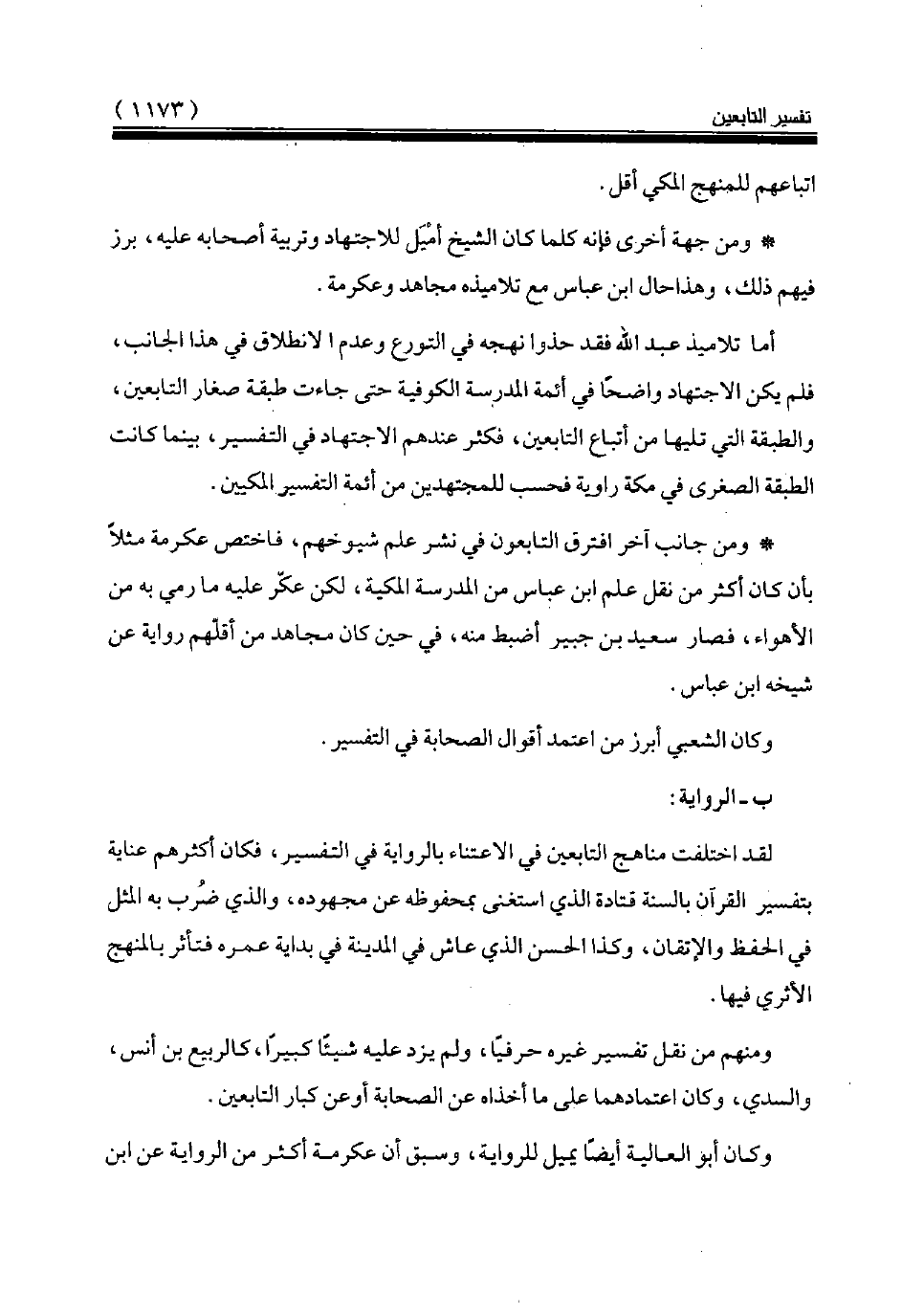 عباس، واشتغل بذلك، وإن كان سعيد بن جبير أكثر قبولا وضبطا منه، إلا أن عناية عكرمة بأسباب النزول كانت أكثر، ويعد إبراهيم أقلهم اعتناء بالأثر والرواية فيما ظهر لي، ومن أكثرهم اشتغالا بفقه الرأي.