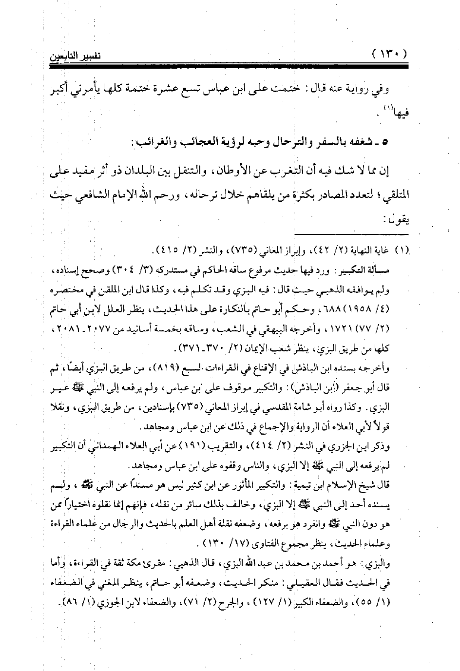 وذكر ابن الجزري في النشر (2/ 414)، والتقريب (191) عن أبي العلاء الهمداني أن التكبير لم يرفعه إلى النبي صلى الله عليه وسلم إلا البزي، والناس وقفوه على ابن عباس ومجاهد.