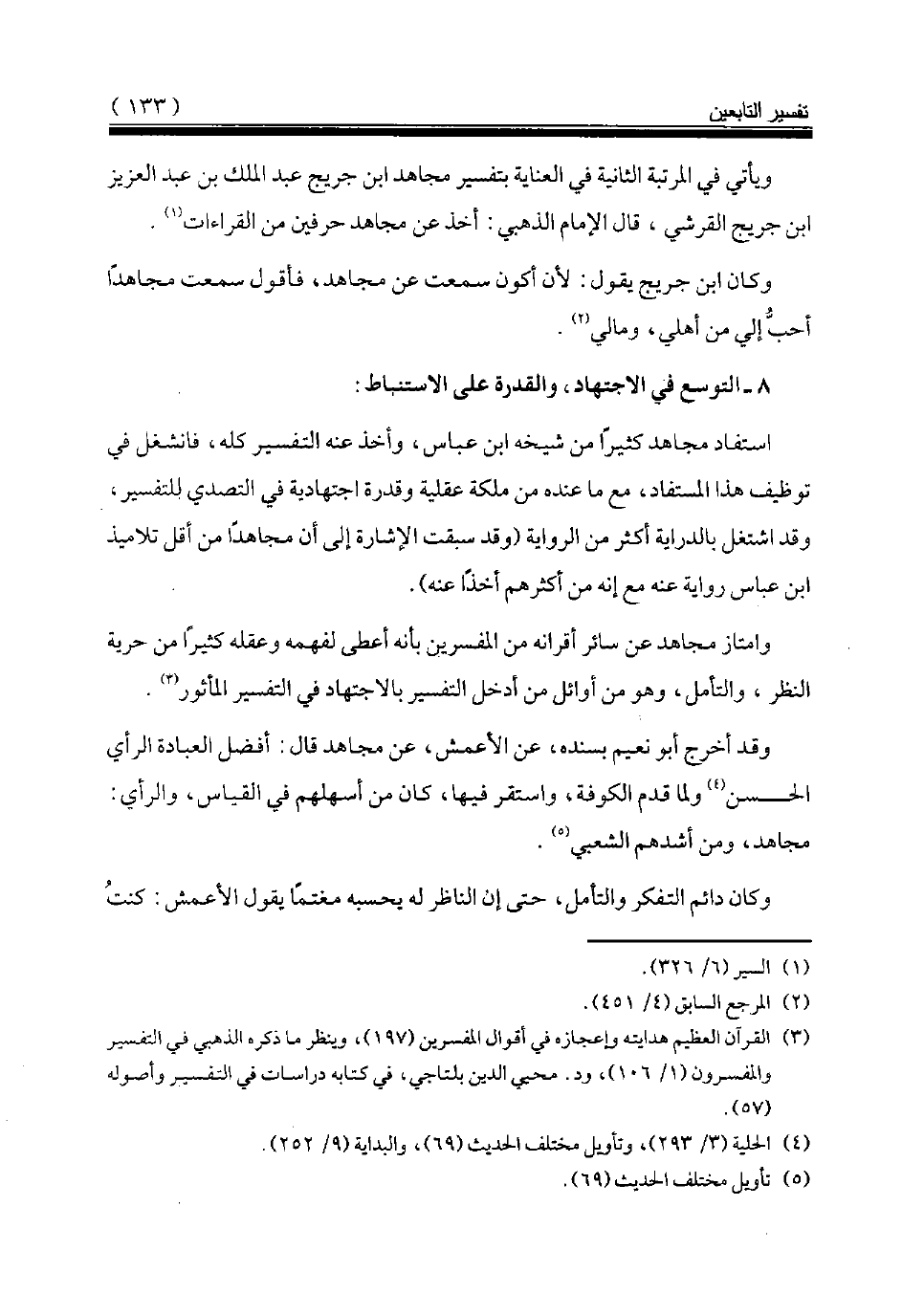 وامتاز مجاهد عن سائر أقرانه من المفسرين بأنه أعطى لفهمه وعقله كثيرا من حرية النظر، والتأمل، وهو من أوائل من أدخل التفسير بالاجتهاد في التفسير المأثور (¬3).