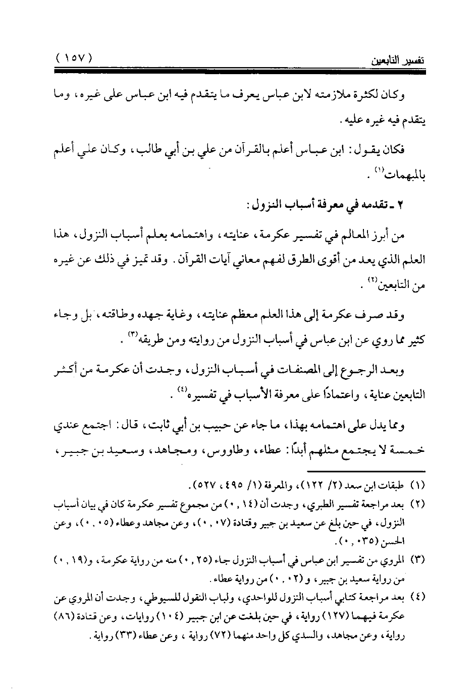 (¬4) بعد مراجعة كتابي أسباب النزول للواحدي، ولباب النقول للسيوطي، وجدت أن المروي عن عكرمة فيهما (127) رواية، في حين بلغت عن ابن جبير (104) روايات، وعن قتادة (86) رواية، وعن مجاهد، والسدي كل واحد منهما (72) رواية، وعن عطاء (33) رواية.
