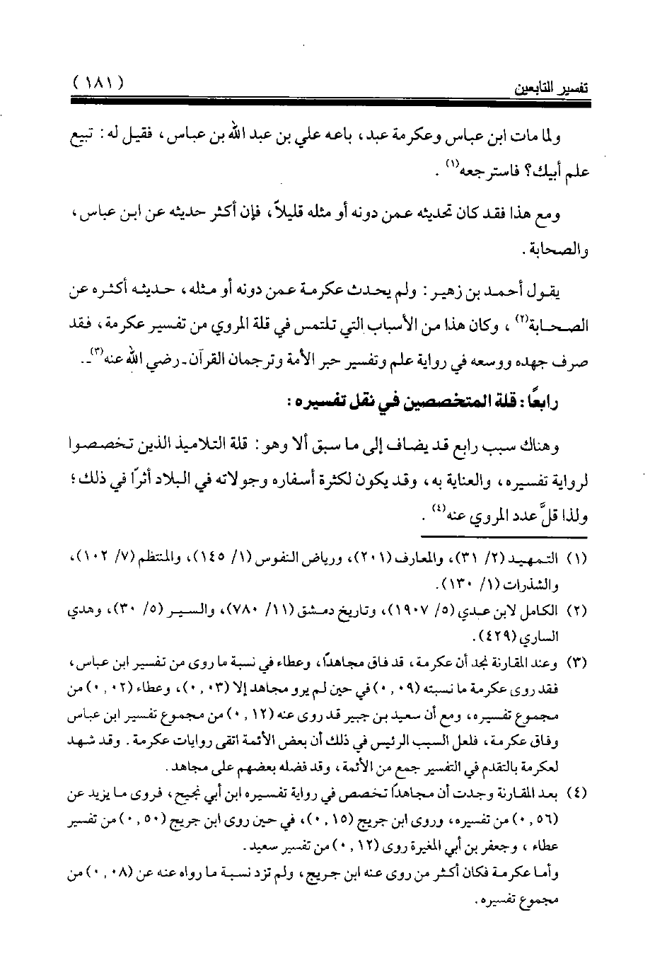 (¬3) وعند المقارنة نجد أن عكرمة، قد فاق مجاهدا، وعطاء في نسبة ما روى من تفسير ابن عباس، فقد روى عكرمة ما نسبته (09، 0) في حين لم يرو مجاهد إلا (03، 0)، وعطاء (02، 0) من مجموع تفسيره، ومع أن سعيد بن جبير قد روى عنه (12، 0) من مجموع تفسير ابن عباس وفاق عكرمة، فلعل السبب الرئيس في ذلك أن بعض الأئمة اتقى روايات عكرمة. وقد شهد لعكرمة بالتقدم في التفسير جمع من الأئمة، وقد فضله بعضهم على مجاهد.