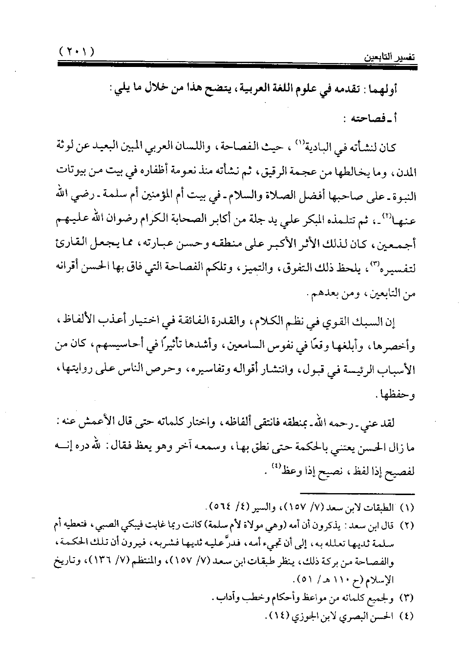 كان لنشأته في البادية (¬1)، حيث الفصاحة، واللسان العربي المبين البعيد عن لوثة المدن، وما يخالطها من عجمة الرقيق، ثم نشأته منذ نعومة أظفاره في بيت من بيوتات النبوة على صاحبها أفضل الصلاة والسلام في بيت أم المؤمنين أم سلمة رضي الله عنها (¬2)، ثم تتلمذه المبكر علي يد جلة من أكابر الصحابة الكرام رضوان الله عليهم أجمعين، كان لذلك الأثر الأكبر على منطقه وحسن عبارته، مما يجعل القارئ لتفسيره (¬3)، يلحظ ذلك التفوق، والتميز، وتلكم الفصاحة التي فاق بها الحسن أقرانه من التابعين، ومن بعدهم.