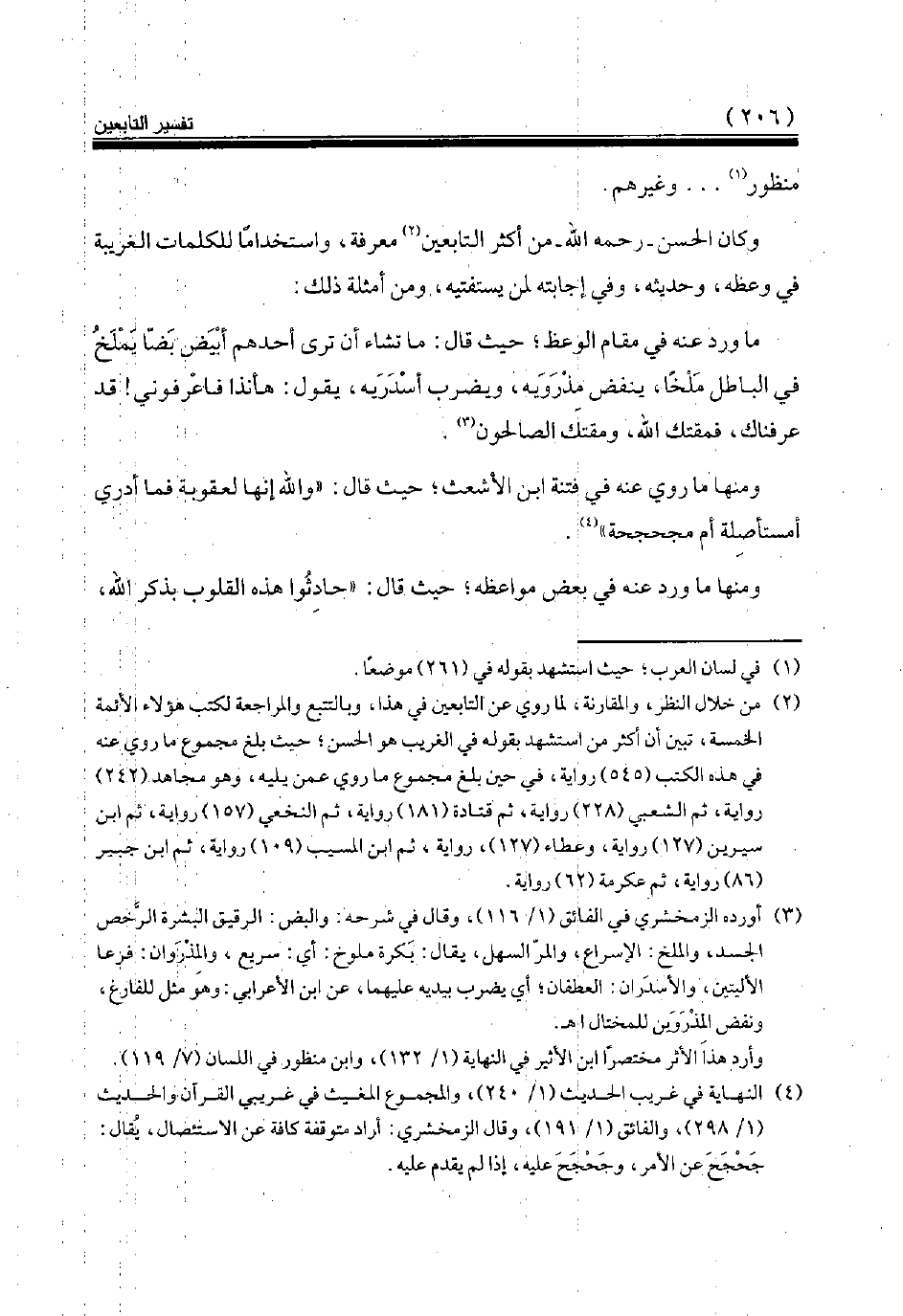 (¬2) من خلال النظر، والمقارنة، لما روي عن التابعين في هذا، وبالتتبع والمراجعة لكتب هؤلاء الأئمة الخمسة، تبين أن أكثر من استشهد بقوله في الغريب هو الحسن حيث بلغ مجموع ما روي عنه في هذه الكتب (545) رواية، في حين بلغ مجموع ما روي عمن يليه، وهو مجاهد (242) رواية، ثم الشعبي (228) رواية، ثم قتادة (181) رواية، ثم النخعي (157) رواية، ثم ابن سيرين (127) رواية، وعطاء (127)، رواية، ثم ابن المسيب (109) رواية، ثم ابن جبير (86) رواية، ثم عكرمة (62) رواية.