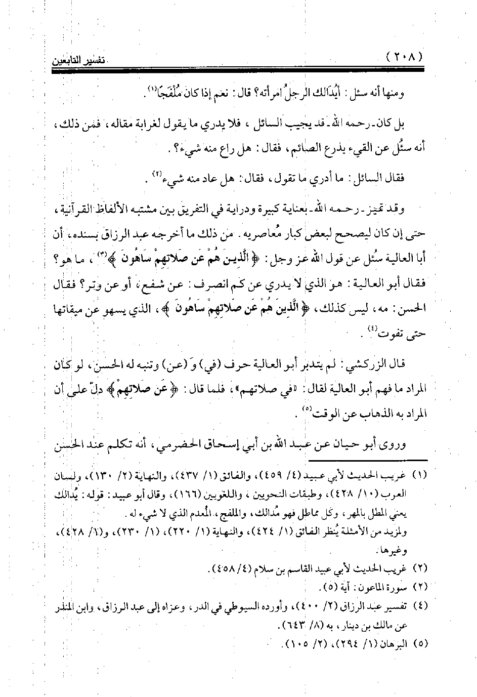 قال الزركشي: لم يتدبر أبو العالية حرف (في) و (عن) وتنبه له الحسن، لو كان المراد ما فهم أبو العالية لقال: «في صلاتهم»، فلما قال: {عَنْ صَلَاتِهِمْ} دلّ على أن المراد به الذهاب عن الوقت (¬5).