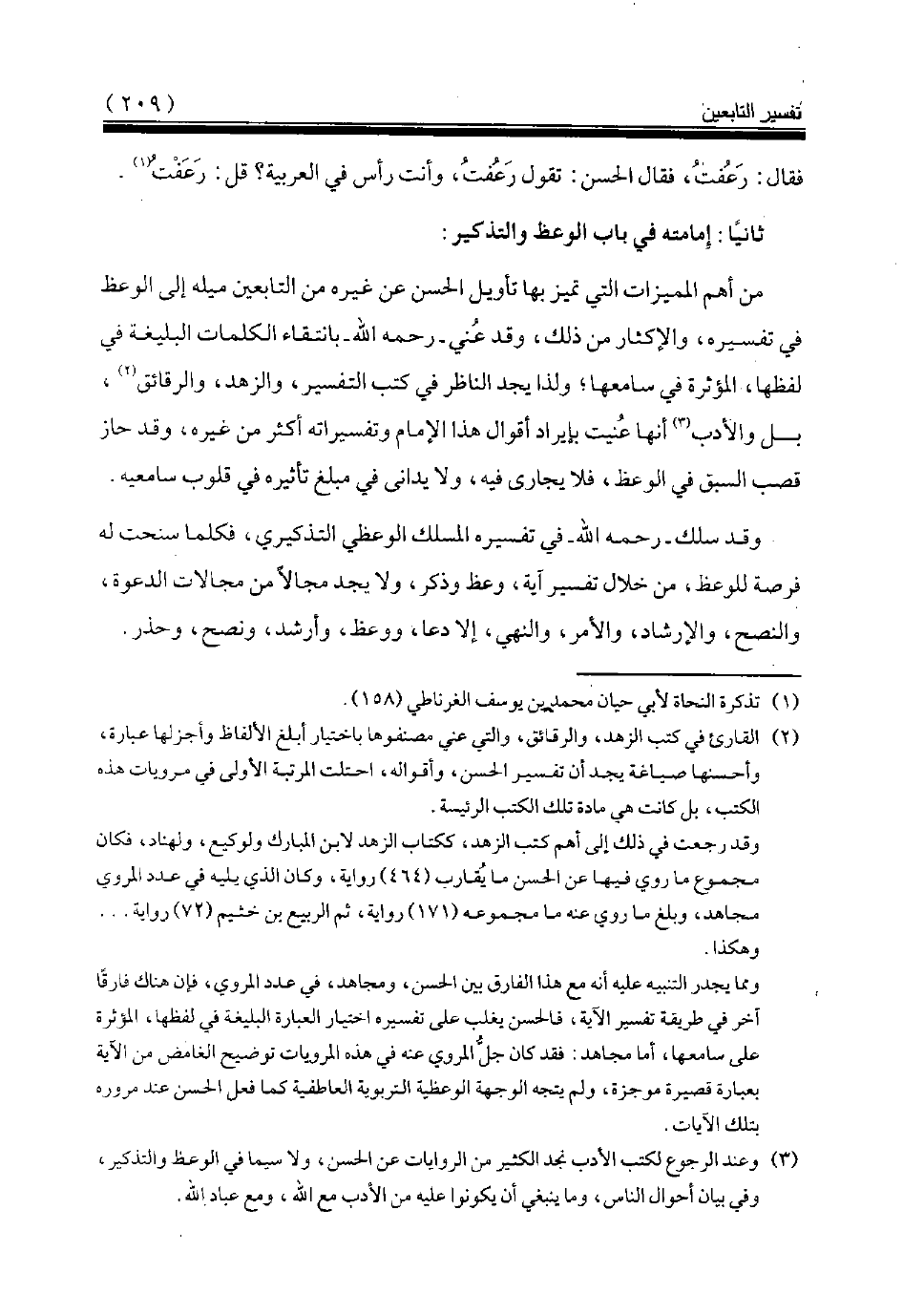 (¬2) القارئ في كتب الزهد، والرقائق، والتي عني مصنفوها باختيار أبلغ الألفاظ وأجزلها عبارة، وأحسنها صياغة يجد أن تفسير الحسن، وأقواله، احتلت المرتبة الأولى في مرويات هذه الكتب، بل كانت هي مادة تلك الكتب الرئيسة.
