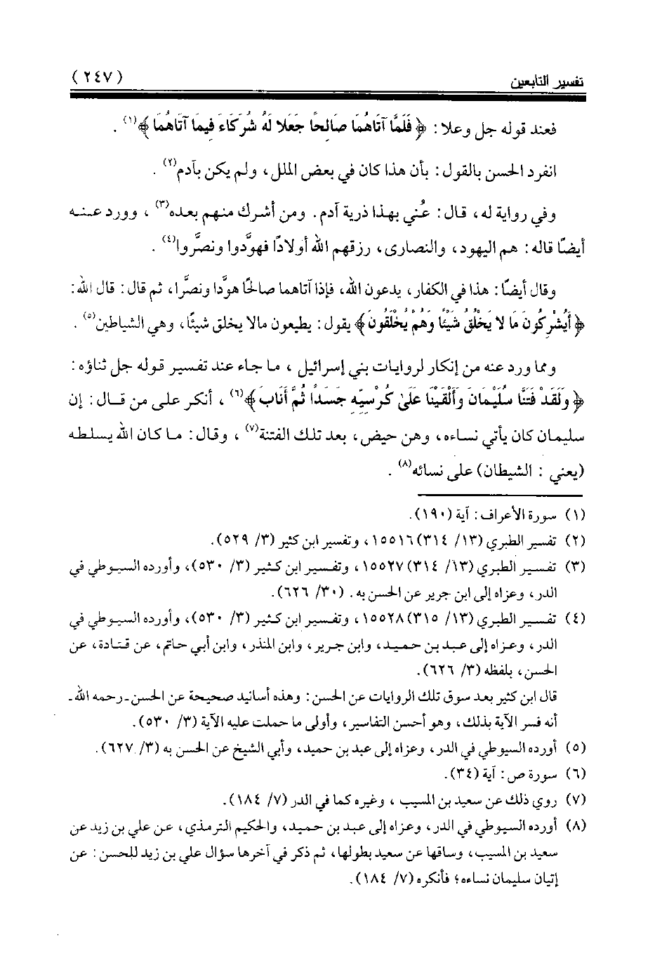 {وَلَقَدْ فَتَنَّا سُلَيْمَانَ وَأَلْقَيْنَا عَلى َ كُرْسِيِّهِ جَسَداً ثُمَّ أَنَابَ} (¬6)، أنكر على من قال: إن سليمان كان يأتي نساءه، وهن حيض، بعد تلك الفتنة (¬7)، وقال: ما كان الله يسلطه (يعني: الشيطان) على نسائه (¬8).
