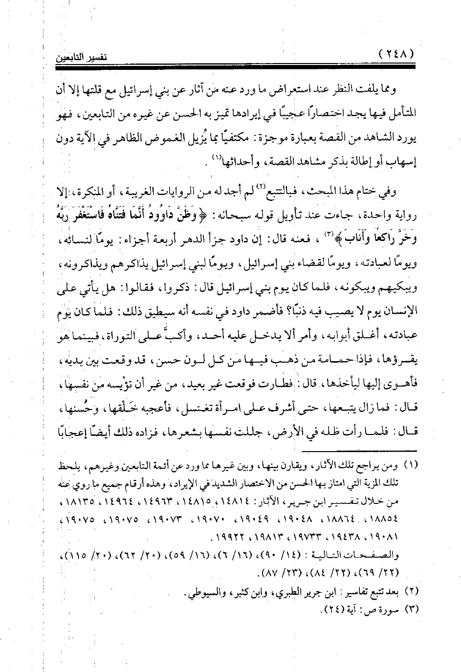وفي ختام هذا المبحث، فبالتتبع (¬2) لم أجد له من الروايات الغريبة، أو المنكرة، إلا رواية واحدة، جاءت عند تأويل قوله سبحانه: {وَظَنَّ دَاوُدُ أَنَّمَا فَتَنَّاهُ فَاسْتَغْفَرَ رَبَّهُ وَخَرَّ رَاكِعاً وَأَنَابَ} (¬3)، فعنه قال: إن داود جزأ الدهر أربعة أجزاء: يوما لنسائه، ويوما لعبادته، ويوما لقضاء بني إسرائيل، ويوما لبني إسرائيل يذاكرهم ويذاكرونه، ويبكيهم ويبكونه، فلما كان يوم بني إسرائيل قال: ذكروا، فقالوا: هل يأتي على الإنسان يوم لا يصيب فيه ذنبا؟ فأضمر داود في نفسه أنه سيطيق ذلك: فلما كان يوم عبادته، أغلق أبوابه، وأمر ألا يدخل عليه أحد، وأكبّ على التوراة، فبينما هو يقرؤها، فإذا حمامة من ذهب فيها من كل لون حسن، قد وقعت بين يديه، فأهوى إليها ليأخذها، قال: فطارت فوقعت غير بعيد، من غير أن تؤيسه من نفسها، قال: فما زال يتبعها، حتى أشرف على امرأة تغتسل، فأعجبه خلقها، وحسنها، قال: فلما رأت ظله في الأرض، جللت نفسها بشعرها، فزاده ذلك أيضا إعجابا