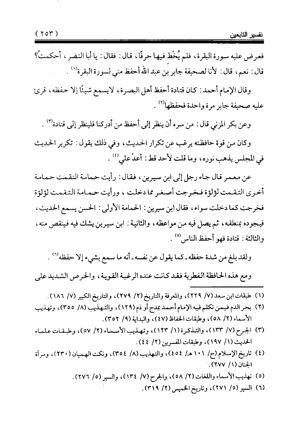 وقال الإمام أحمد: كان قتادة أحفظ أهل البصرة، لا يسمع شيئا إلا حفظه، قرئ عليه صحيفة جابر مرة واحدة فحفظها (¬2).