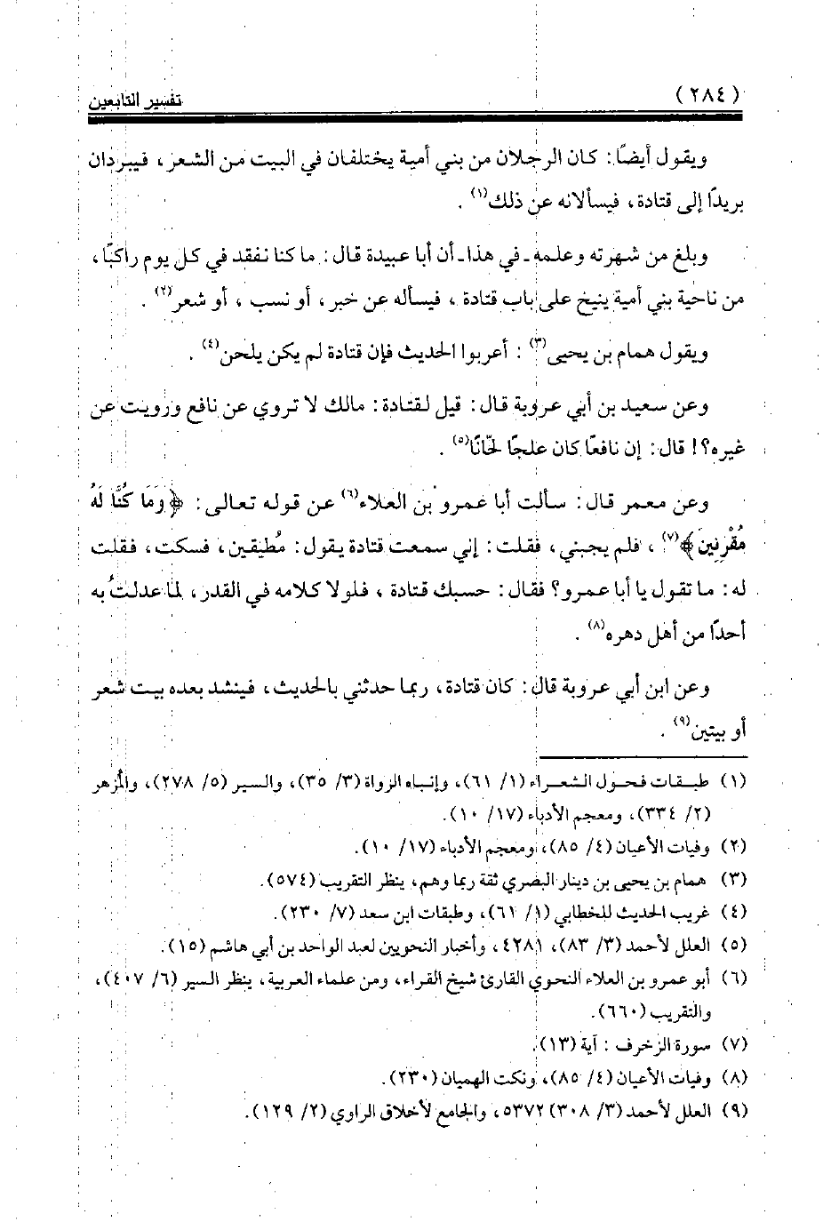 ويقول أيضا: كان الرجلان من بني أمية يختلفان في البيت من الشعر، فيبردان بريدا إلى قتادة، فيسألانه عن ذلك (¬1).
