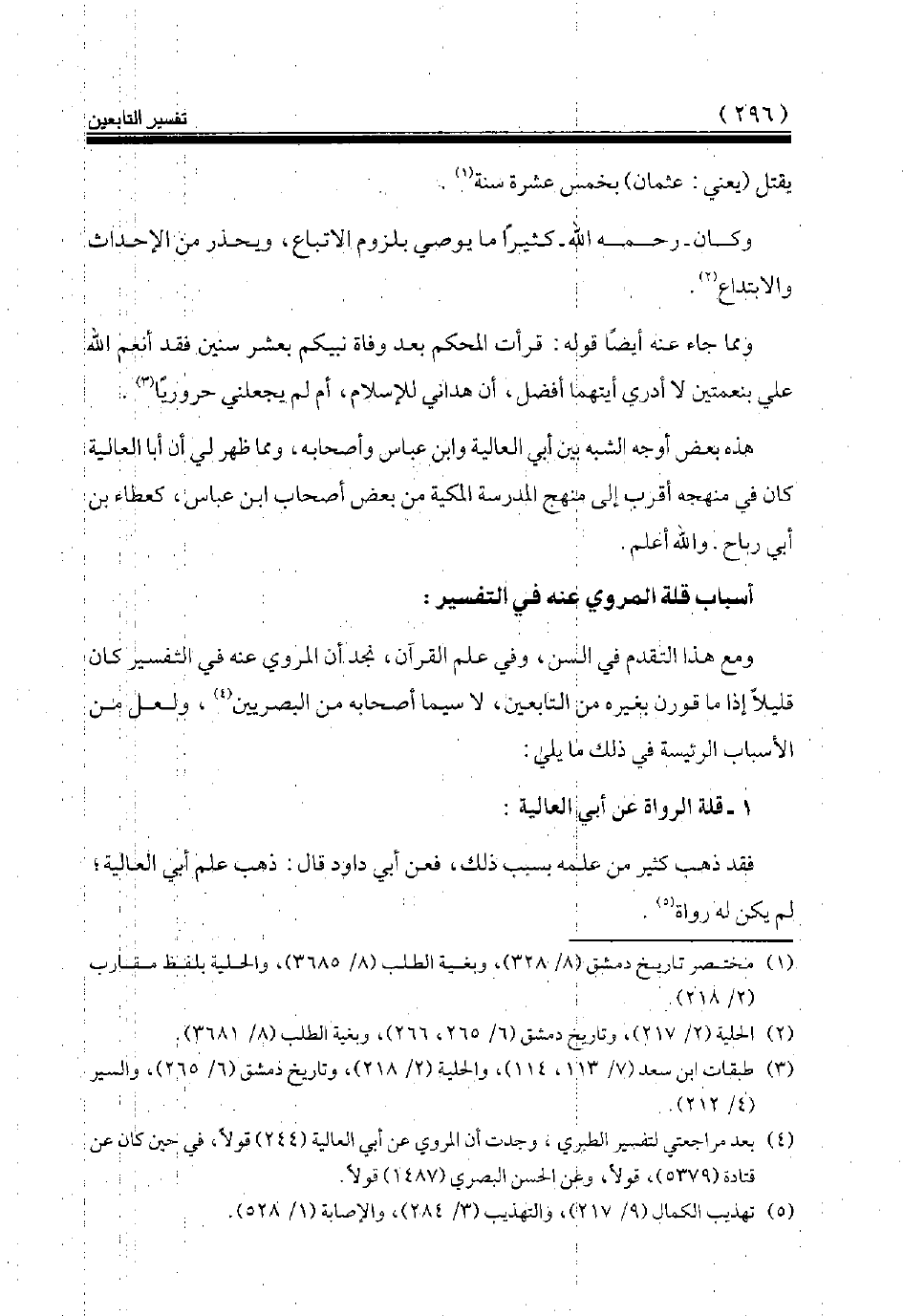 (¬4) بعد مراجعتي لتفسير الطبري، وجدت أن المروي عن أبي العالية (244) قولا، في حين كان عن قتادة (5379)، قولا، وعن الحسن البصري (1487) قولا.