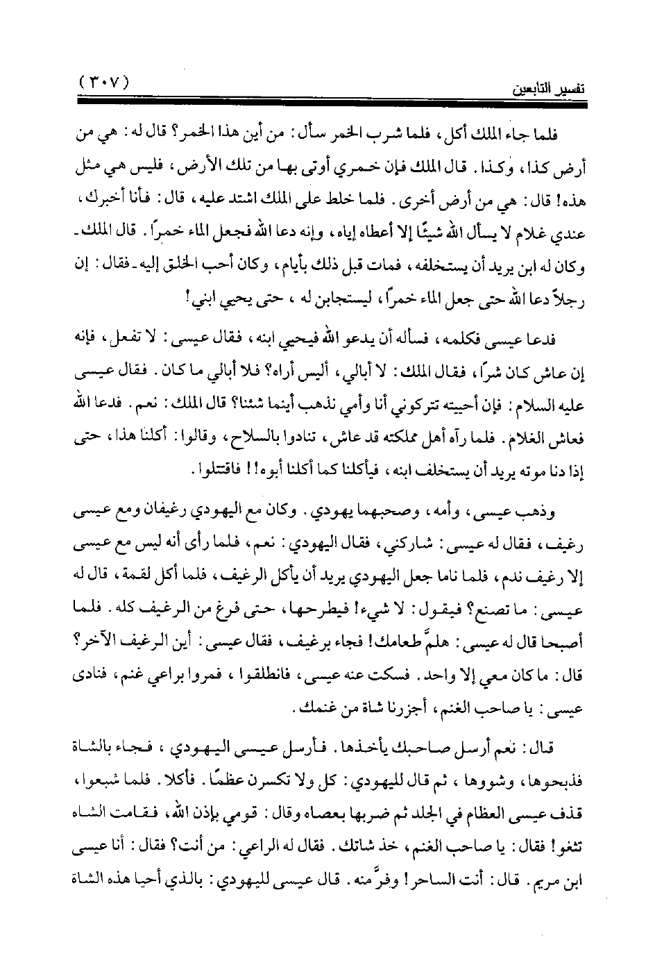 قال: نعم أرسل صاحبك يأخذها. فأرسل عيسى اليهودي، فجاء بالشاة فذبحوها، وشووها، ثم قال لليهودي: كل ولا تكسرن عظما. فأكلا. فلما شبعوا، قذف عيسى العظام في الجلد ثم ضربها بعصاه وقال: قومي بإذن الله، فقامت الشاة تثغو! فقال: يا صاحب الغنم، خذ شاتك. فقال له الراعي: من أنت؟ فقال: أنا عيسى ابن مريم. قال: أنت الساحر! وفرّ منه. قال عيسى لليهودي: بالذي أحيا هذه الشاة