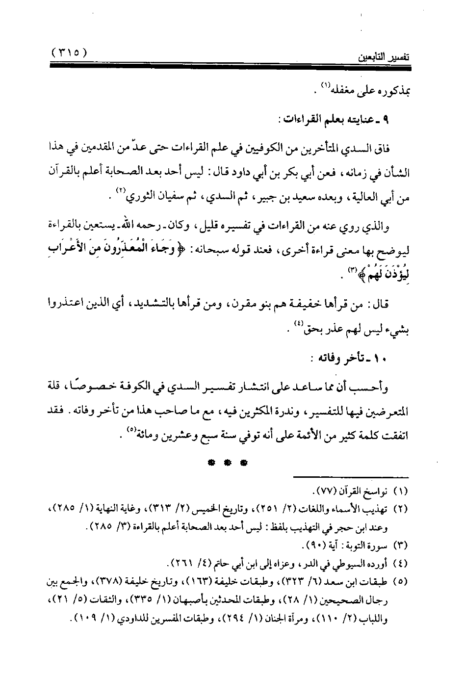 وأحسب أن مما ساعد على انتشار تفسير السدي في الكوفة خصوصا، قلة المتعرضين فيها للتفسير، وندرة المكثرين فيه، مع ما صاحب هذا من تأخر وفاته. فقد اتفقت كلمة كثير من الأئمة على أنه توفي سنة سبع وعشرين ومائة (¬5).