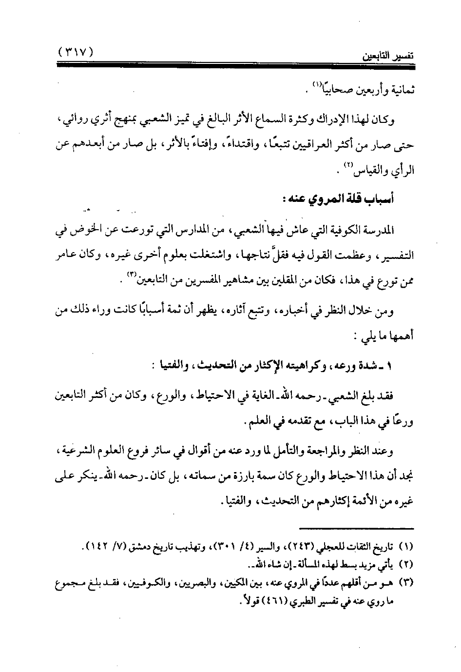 المدرسة الكوفية التي عاش فيها الشعبي، من المدارس التي تورعت عن الخوض في التفسير، وعظمت القول فيه فقلّ نتاجها، واشتغلت بعلوم أخرى غيره، وكان عامر ممن تورع في هذا، فكان من المقلين بين مشاهير المفسرين من التابعين (¬3).