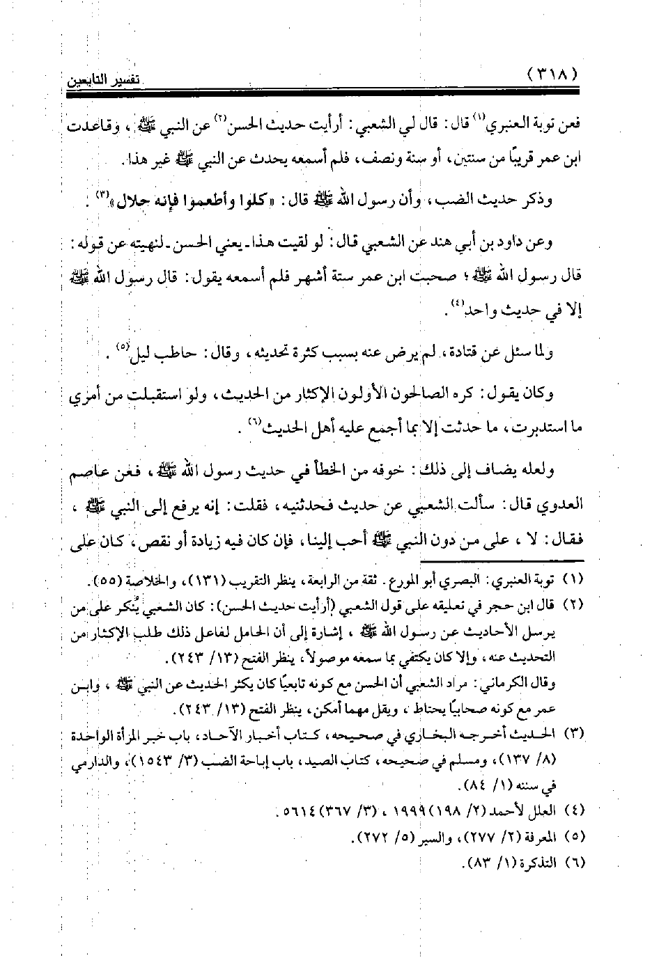 (¬2) قال ابن حجر في تعليقه على قول الشعبي (أرأيت حديث الحسن): كان الشعبي ينكر على من يرسل الأحاديث عن رسول الله صلى الله عليه وسلّم، إشارة إلى أن الحامل لفاعل ذلك طلب الإكثار من التحديث عنه، وإلا كان يكتفي بما سمعه موصولا، ينظر الفتح (13/ 243).