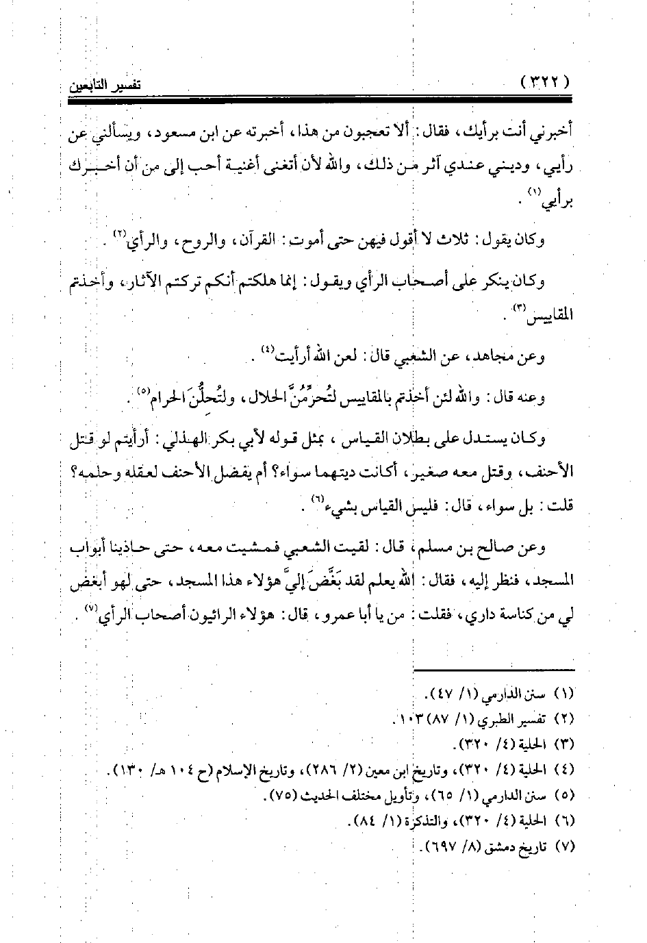 وعن صالح بن مسلم، قال: لقيت الشعبي فمشيت معه، حتى حاذينا أبواب المسجد، فنظر إليه، فقال: الله يعلم لقد بغّض إليّ هؤلاء هذا المسجد، حتى لهو أبغض لي من كناسة داري، فقلت: من يا أبا عمرو، قال: هؤلاء الرائيون أصحاب الرأي (¬7).