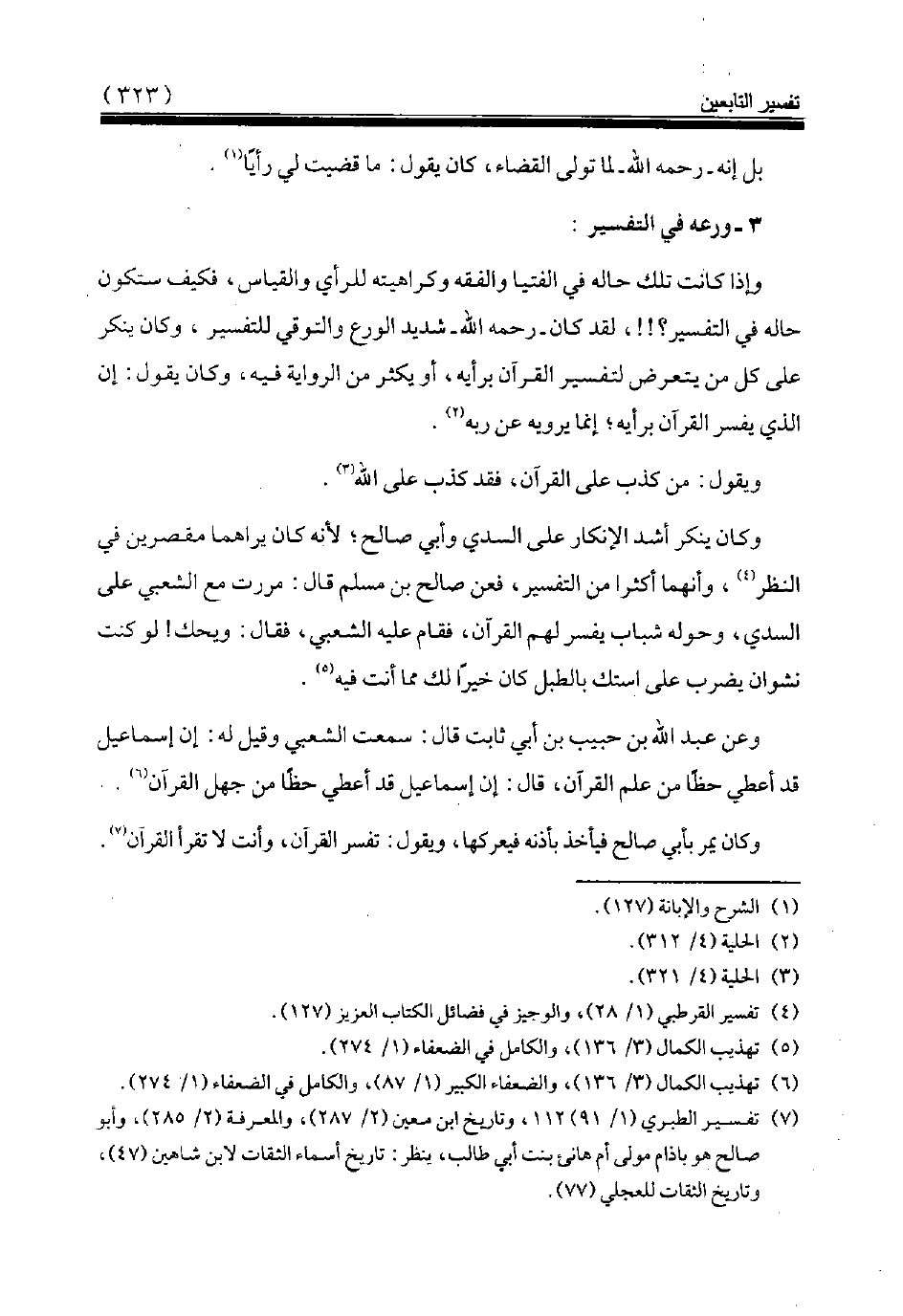 وكان ينكر أشد الإنكار على السدي وأبي صالح لأنه كان يراهما مقصرين في النظر (¬4)، وأنهما أكثرا من التفسير، فعن صالح بن مسلم قال: مررت مع الشعبي على السدي، وحوله شباب يفسر لهم القرآن، فقام عليه الشعبي، فقال: ويحك! لو كنت نشوان يضرب على استك بالطبل كان خيرا لك مما أنت فيه (¬5).