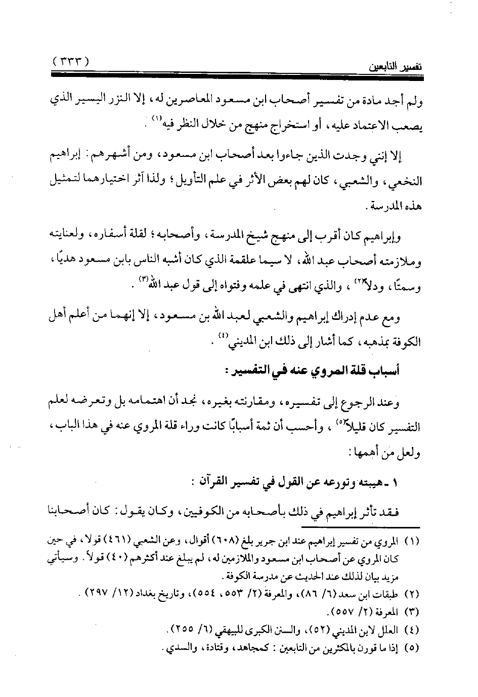 (¬1) المروي من تفسير إبراهيم عند ابن جرير بلغ (608) أقوال، وعن الشعبي (461) قولا، في حين كان المروي عن أصحاب ابن مسعود والملازمين له، لم يبلغ عند أكثرهم (40) قولا. وسيأتي مزيد بيان لذلك عند الحديث عن مدرسة الكوفة.