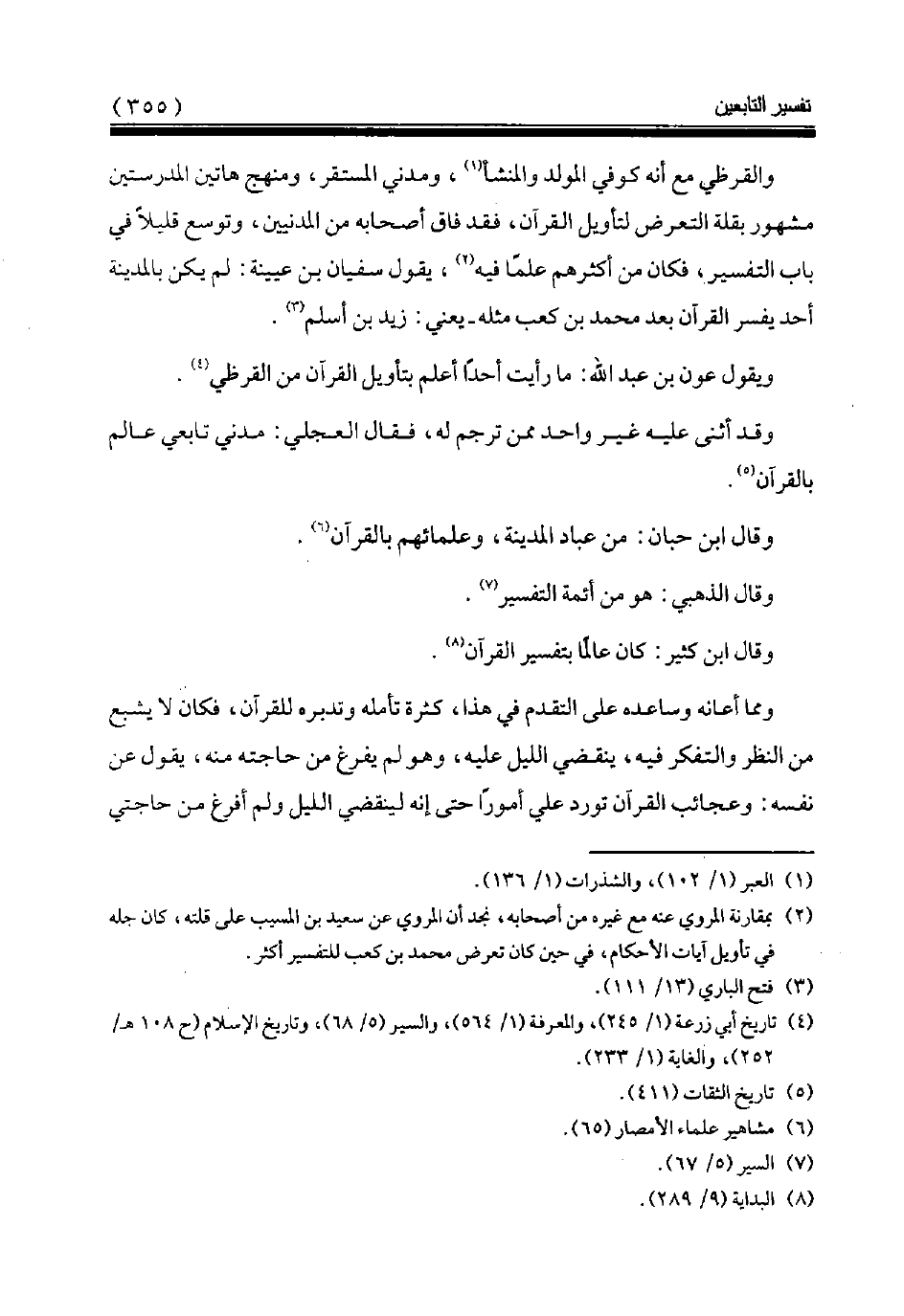 والقرظي مع أنه كوفي المولد والمنشأ (¬1)، ومدني المستقر، ومنهج هاتين المدرستين مشهور بقلة التعرض لتأويل القرآن، فقد فاق أصحابه من المدنيين، وتوسع قليلا في باب التفسير، فكان من أكثرهم علما فيه (¬2)، يقول سفيان بن عيينة: لم يكن بالمدينة أحد يفسر القرآن بعد محمد بن كعب مثله يعني: زيد بن أسلم (¬3).