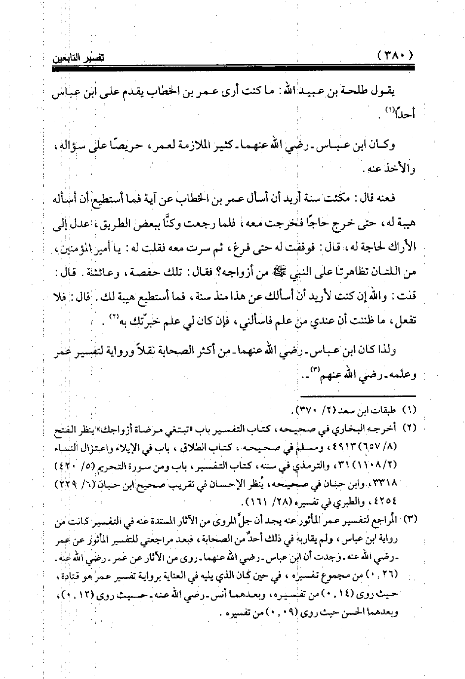 (¬3) المراجع لتفسير عمر المأثور عنه يجد أن جلّ المروى من الآثار المسندة عنه في التفسير كانت من رواية ابن عباس، ولم يقاربه في ذلك أحد من الصحابة، فبعد مراجعتي للتفسير المأثور عن عمر رضي الله عنه وجدت أن ابن عباس رضي الله عنهما روى من الآثار عن عمر رضي الله عنه (26، 0) من مجموع تفسيره، في حين كان الذي يليه في العناية برواية تفسير عمر هو قتادة، حيث روى (14، 0) من تفسيره، وبعدهما أنس رضي الله عنه حيث روى (12، 0)، وبعدهما الحسن حيث روى (09، 0) من تفسيره.