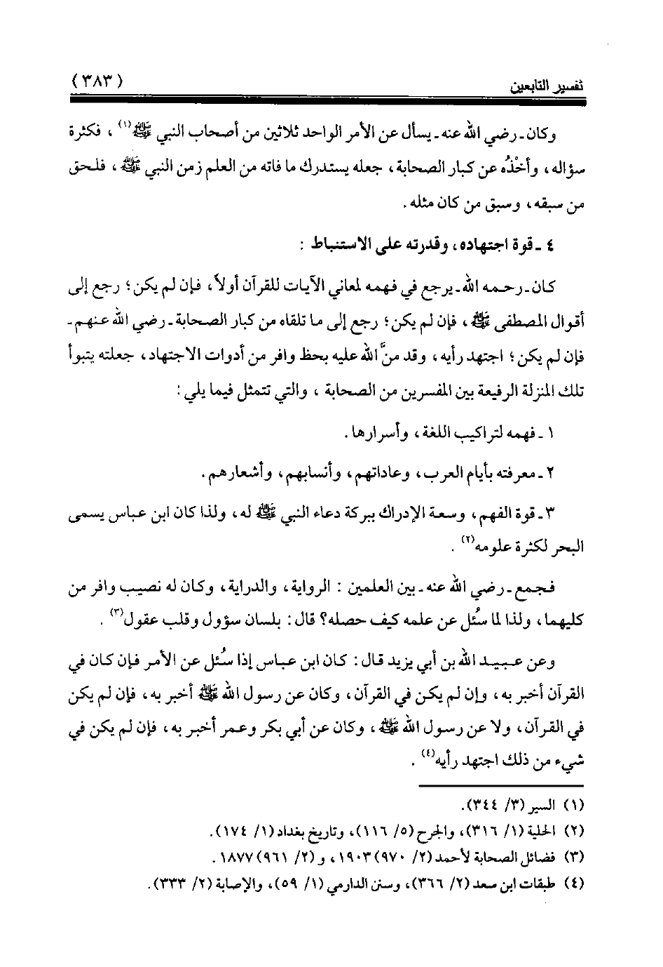 وعن عبيد الله بن أبي يزيد قال: كان ابن عباس إذا سئل عن الأمر فإن كان في القرآن أخبر به، وإن لم يكن في القرآن، وكان عن رسول الله صلى الله عليه وسلّم أخبر به، فإن لم يكن في القرآن، ولا عن رسول الله صلى الله عليه وسلّم، وكان عن أبي بكر وعمر أخبر به، فإن لم يكن في شيء من ذلك اجتهد رأيه (¬4).