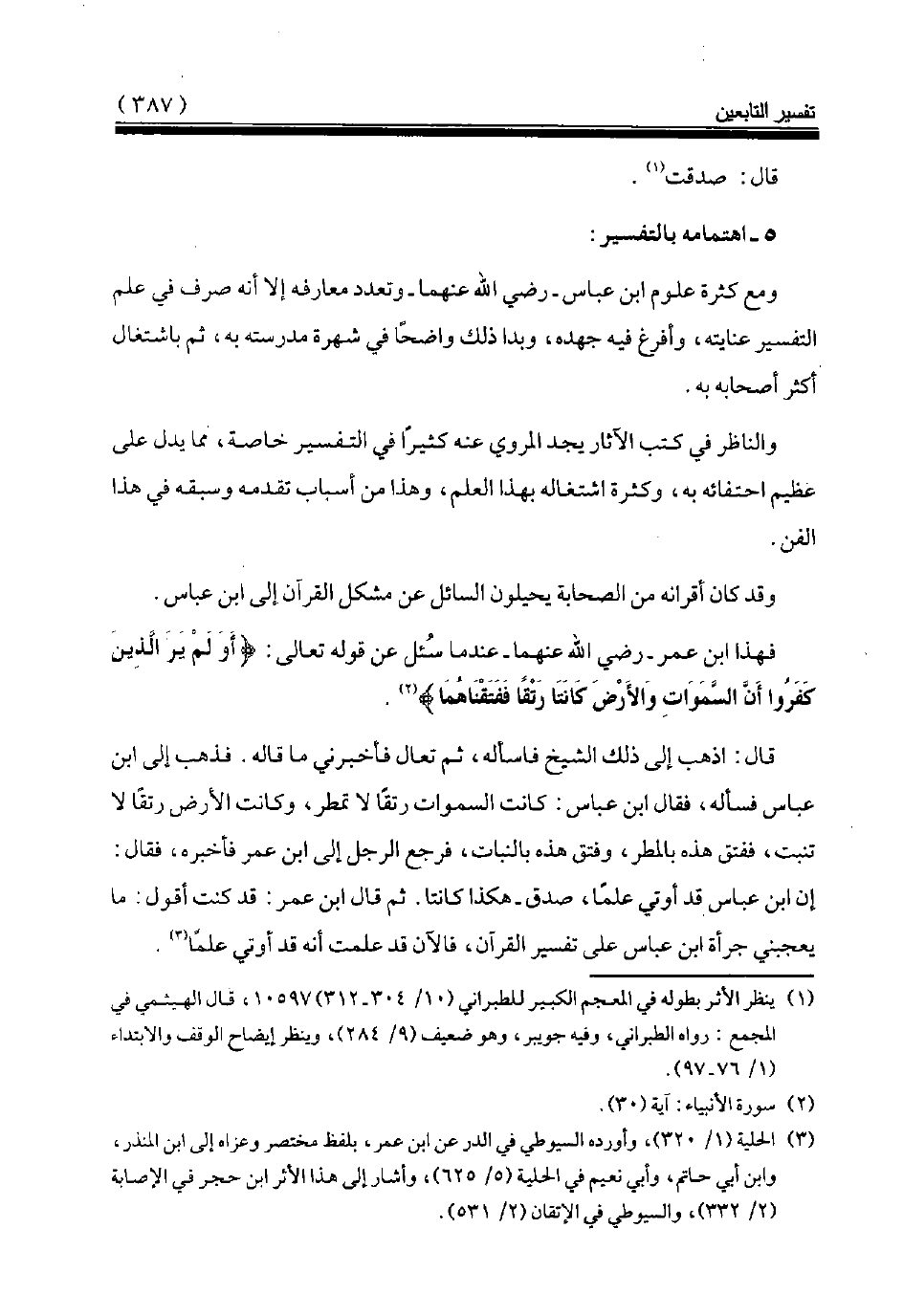 فهذا ابن عمر رضي الله عنهما عند ما سئل عن قوله تعالى: {أَوَلَمْ يَرَ الَّذِينَ كَفَرُوا أَنَّ السَّمَاوَاتِ وَالْأَرْضَ كَانَتَا رَتْقاً فَفَتَقْنَاهُمَا} (¬2).