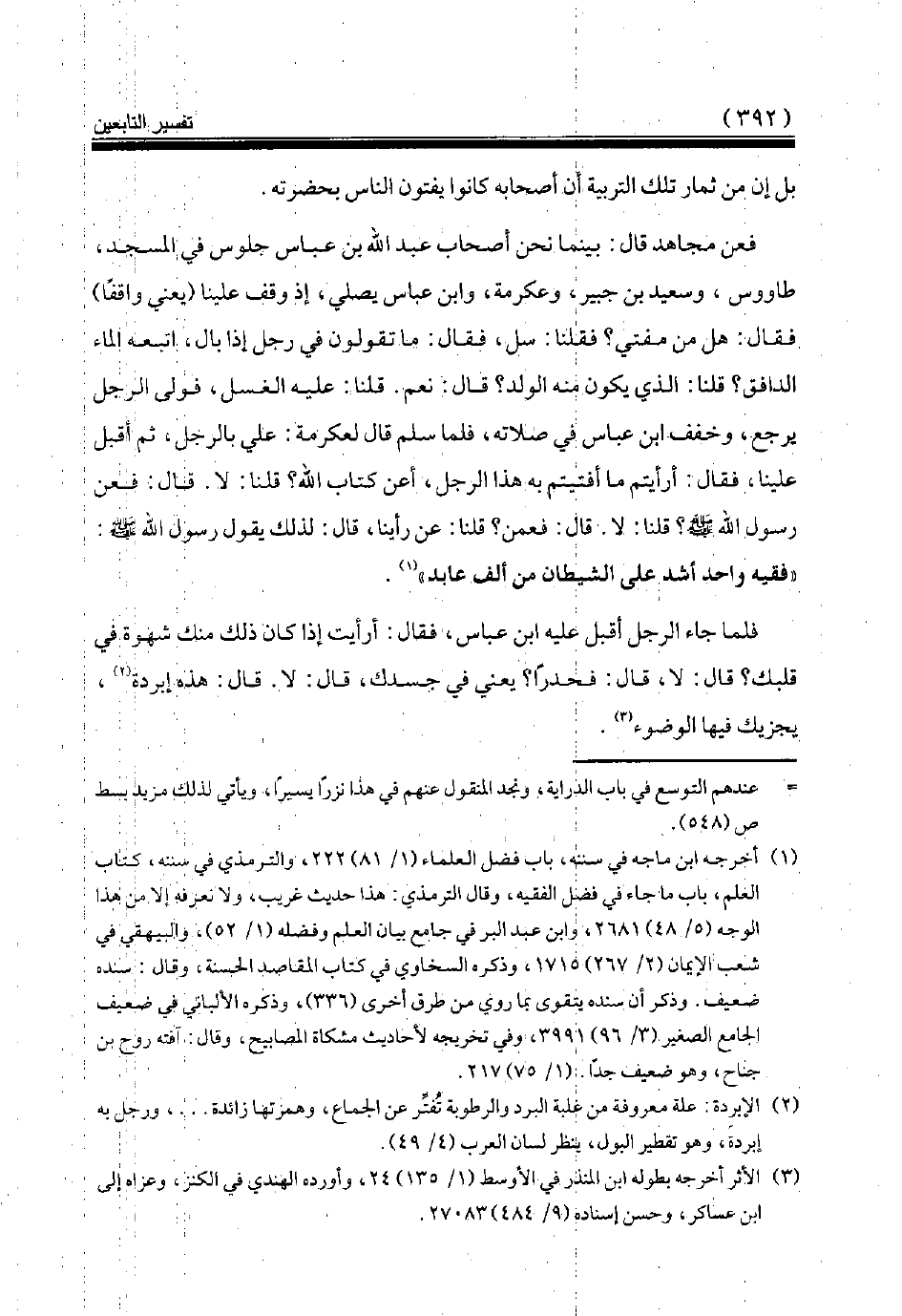 فعن مجاهد قال: بينما نحن أصحاب عبد الله بن عباس جلوس في المسجد، طاوس، وسعيد بن جبير، وعكرمة، وابن عباس يصلي، إذ وقف علينا (يعني واقفا) فقال: هل من مفتي؟ فقلنا: سل، فقال: ما تقولون في رجل إذا بال، اتبعه الماء الدافق؟ قلنا: الذي يكون منه الولد؟ قال: نعم. قلنا: عليه الغسل، فولى الرجل يرجع، وخفف ابن عباس في صلاته، فلما سلم قال لعكرمة: علي بالرجل، ثم أقبل علينا، فقال: أرأيتم ما أفتيتم به هذا الرجل، أعن كتاب الله؟ قلنا: لا. قال: فعن رسول الله صلى الله عليه وسلّم؟ قلنا: لا. قال: فعمن؟ قلنا: عن رأينا، قال: لذلك يقول رسول الله صلى الله عليه وسلّم: