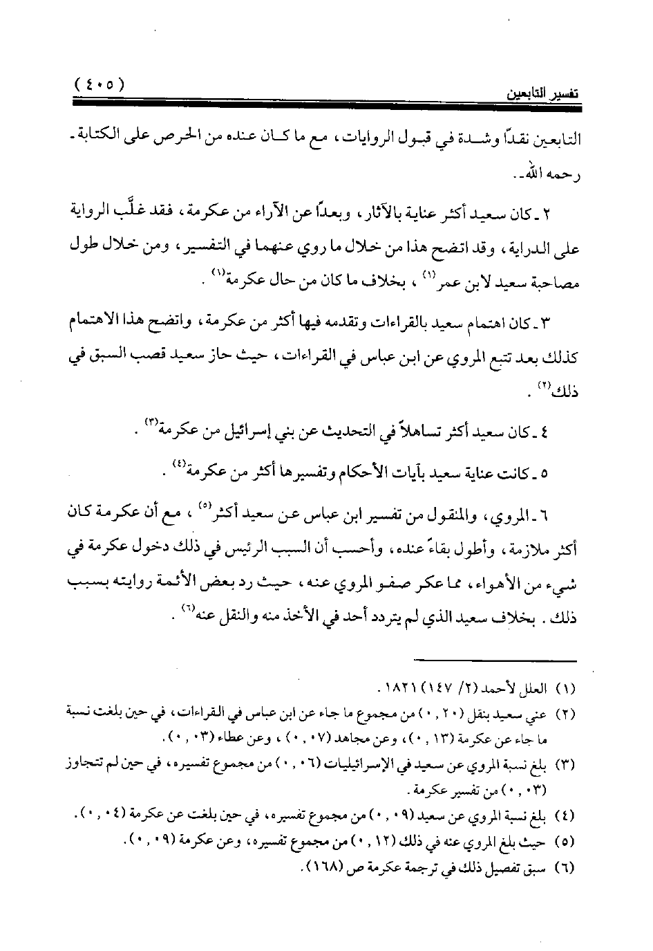 6 - المروي، والمنقول من تفسير ابن عباس عن سعيد أكثر (¬5)، مع أن عكرمة كان أكثر ملازمة، وأطول بقاء عنده، وأحسب أن السبب الرئيس في ذلك دخول عكرمة في شيء من الأهواء، مما عكر صفو المروي عنه، حيث رد بعض الأئمة روايته بسبب ذلك. بخلاف سعيد الذي لم يتردد أحد في الأخذ منه والنقل عنه (¬6).