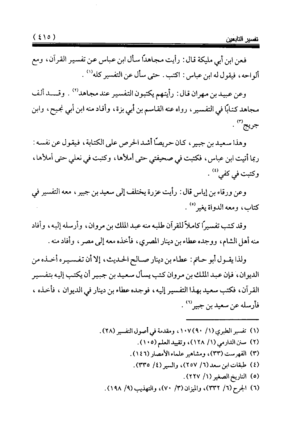 وعن عبيد بن مهران قال: رأيتهم يكتبون التفسير عند مجاهد (¬2). وقد ألف مجاهد كتابا في التفسير، رواه عنه القاسم بن أبي بزة، وأفاد منه ابن أبي نجيح، وابن جريج (¬3).