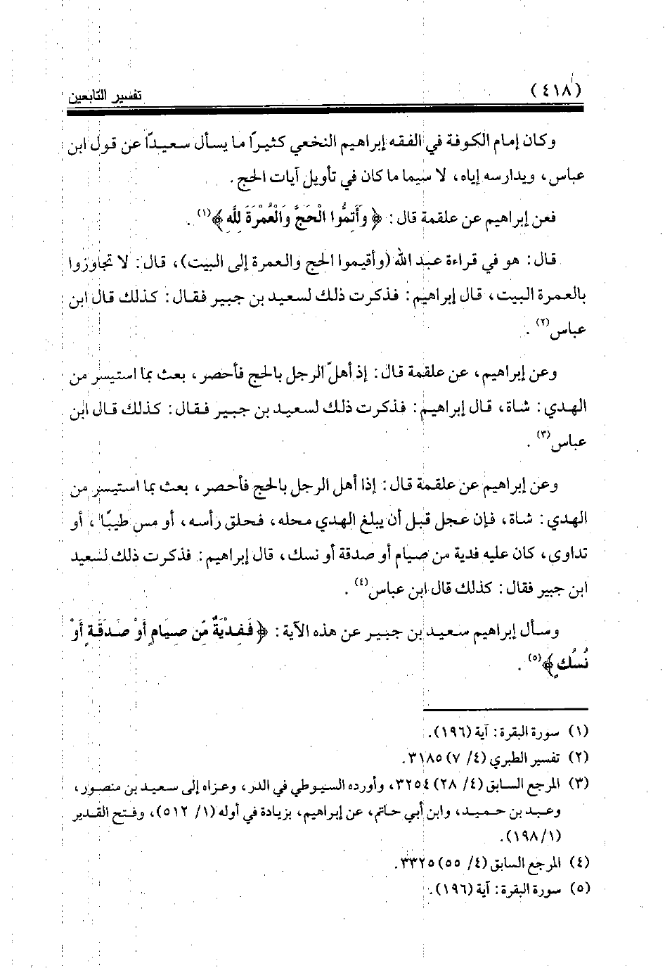 وسأل إبراهيم سعيد بن جبير عن هذه الآية: {فَفِدْيَةٌ مِنْ صِيَامٍ أَوْ صَدَقَةٍ أَوْ نُسُكٍ} (¬5).