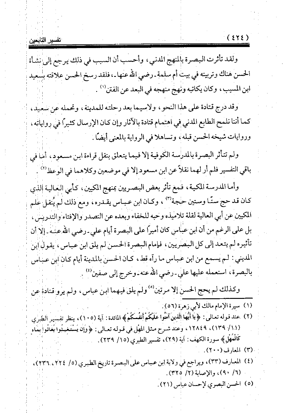 وأما المدرسة المكية، فمع تأثر بعض البصريين بمنهج المكيين، كأبي العالية الذي كان قد حج ستا وستين حجة (¬3)، وكان ابن عباس يقدره، ومع ذلك لم ينقل علم المكيين عن أبي العالية لقلة تلاميذه وحبه للخفاء وبعده عن التصدر والإفتاء والتدريس، بل على الرغم من أن ابن عباس كان أميرا على البصرة أيام علي رضي الله عنه إلا أن تأثيره لم يتعد إلى كل البصريين، فإمام البصرة الحسن لم يلق ابن عباس، يقول ابن المديني: لم يسمع من ابن عباس ما رآه قط، كان الحسن بالمدينة أيام كان ابن عباس بالبصرة، استعمله عليها علي رضي الله عنه وخرج إلى صفين (¬4).