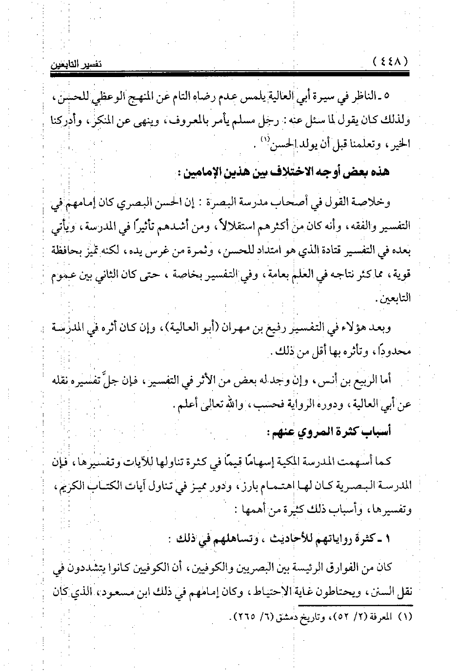 وخلاصة القول في أصحاب مدرسة البصرة: إن الحسن البصري كان إمامهم في التفسير والفقه، وأنه كان من أكثرهم استقلالا، ومن أشدهم تأثيرا في المدرسة، ويأتي بعده في التفسير قتادة الذي هو امتداد للحسن، وثمرة من غرس يده، لكنه تميز بحافظة قوية، مما كثر نتاجه في العلم بعامة، وفي التفسير بخاصة، حتى كان الثاني بين عموم التابعين.