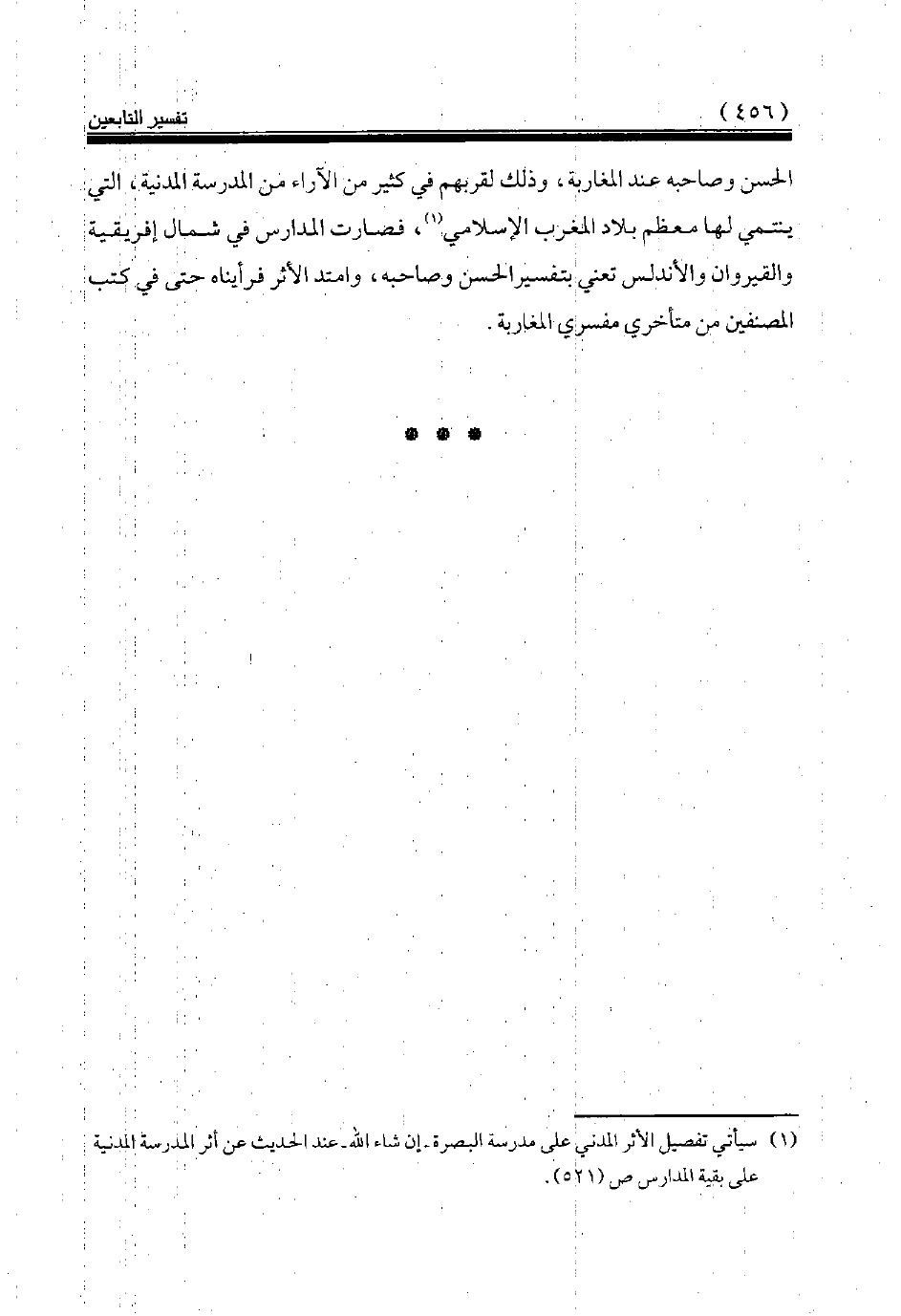 الحسن وصاحبه عند المغاربة، وذلك لقربهم في كثير من الآراء من المدرسة المدنية، التي ينتمي لها معظم بلاد المغرب الإسلامي (¬1)، فصارت المدارس في شمال إفريقية والقيروان والأندلس تعني بتفسير الحسن وصاحبه، وامتد الأثر فرأيناه حتى في كتب المصنفين من متأخري مفسري المغاربة.