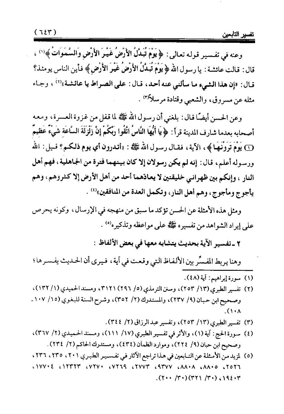 (¬5) لمزيد من الأمثلة عن التابعين في هذا تراجع الآثار في تفسير الطبري 201، 235، 236، 2526، 8805، 8808، 9377، 2773، 7269، 7270، 12323، 17704، 19403، (30/ 321) (30/ 200).