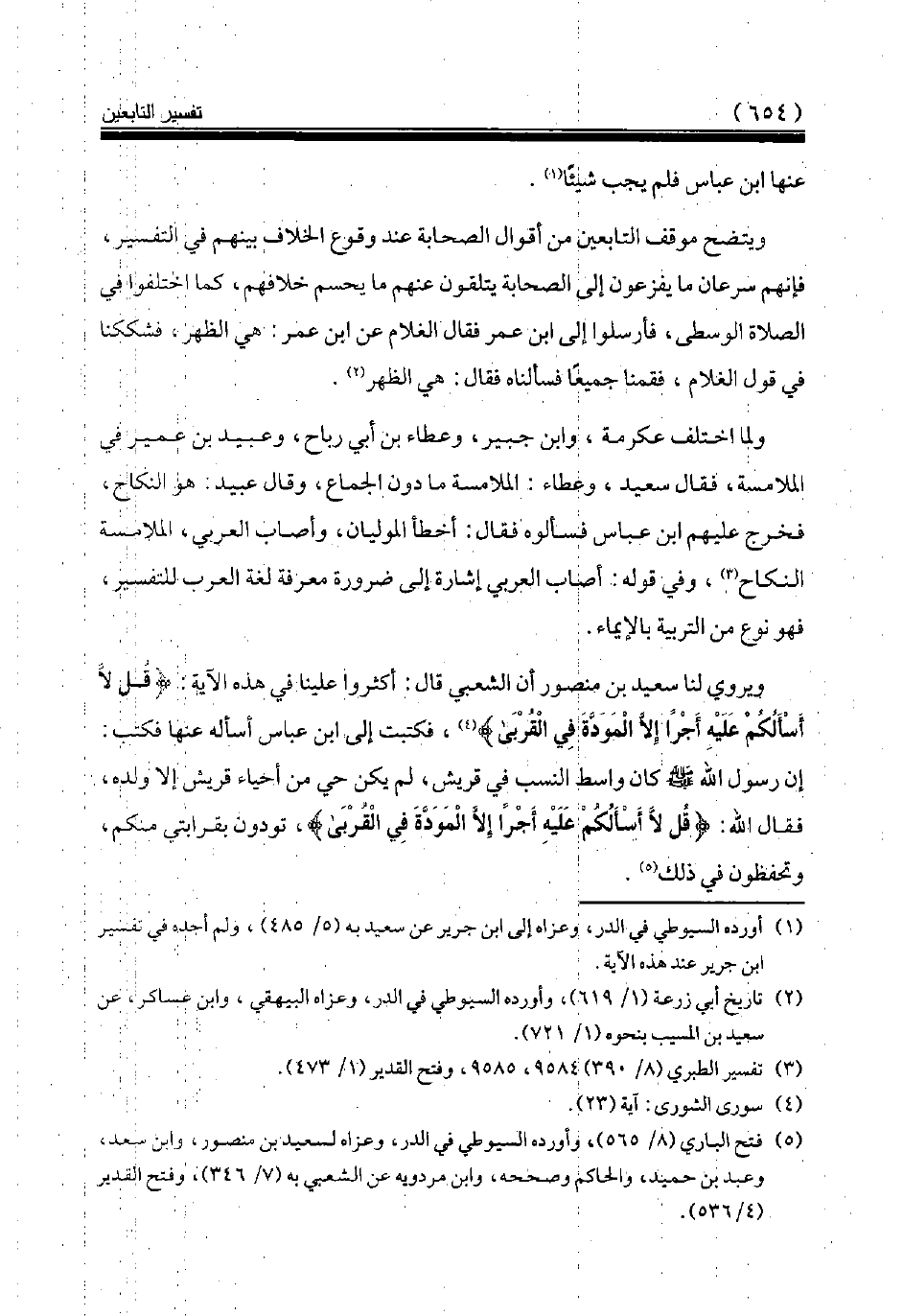 ويروي لنا سعيد بن منصور أن الشعبي قال: أكثروا علينا في هذه الآية: {قُلْ لَا أَسْئَلُكُمْ عَلَيْهِ أَجْراً إِلَّا الْمَوَدَّةَ فِي الْقُرْبى َ} (¬4)، فكتبت إلى ابن عباس أسأله عنها فكتب: