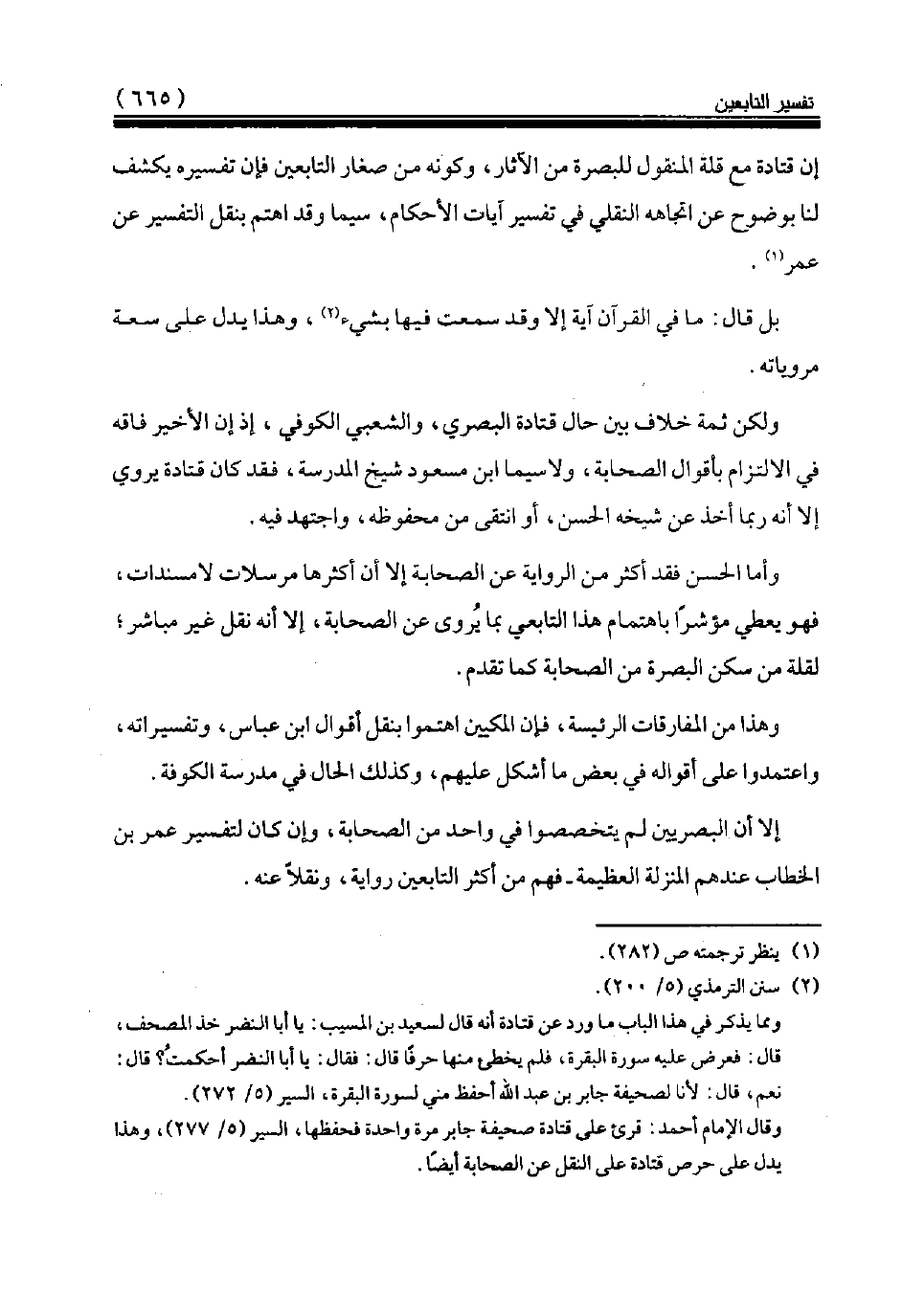 إن قتادة مع قلة المنقول للبصرة من الآثار، وكونه من صغار التابعين فإن تفسيره يكشف لنا بوضوح عن اتجاهه النقلي في تفسير آيات الأحكام، سيما وقد اهتم بنقل التفسير عن عمر (¬1).